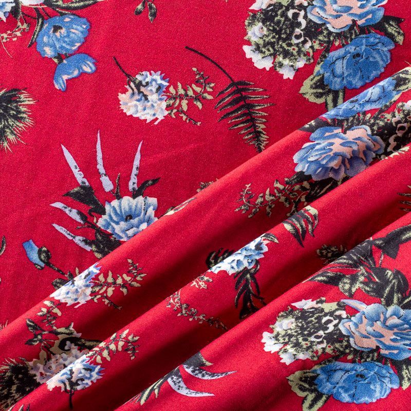 Плательно-блузочный штапель с цветочным принтом на сочном вишневом фоне. Мягкий, тонкий, нежный, пластичный, приятный на ощупь, хорошо драпируется, практичный. Подойдет для пошива платья, топа, блузки, рубашки, юбки, летних брюк.