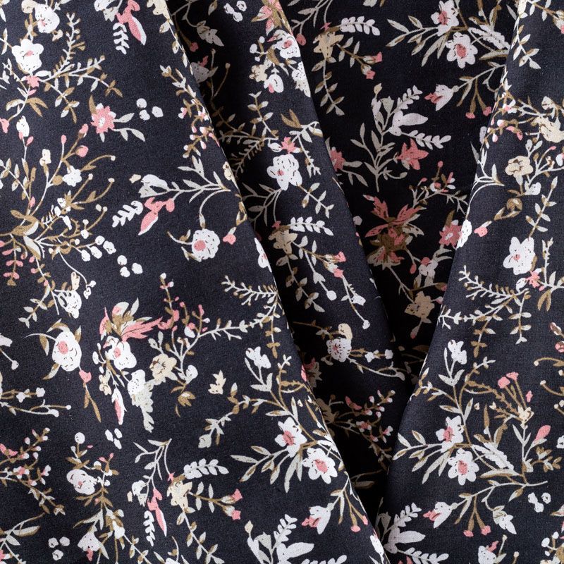 Плательно-блузочный штапель с цветочным принтом на черном фоне. Мягкий, тонкий, нежный, пластичный, приятный на ощупь, хорошо драпируется, практичный. Подойдет для пошива платья, топа, блузки, рубашки, юбки, летних брюк.