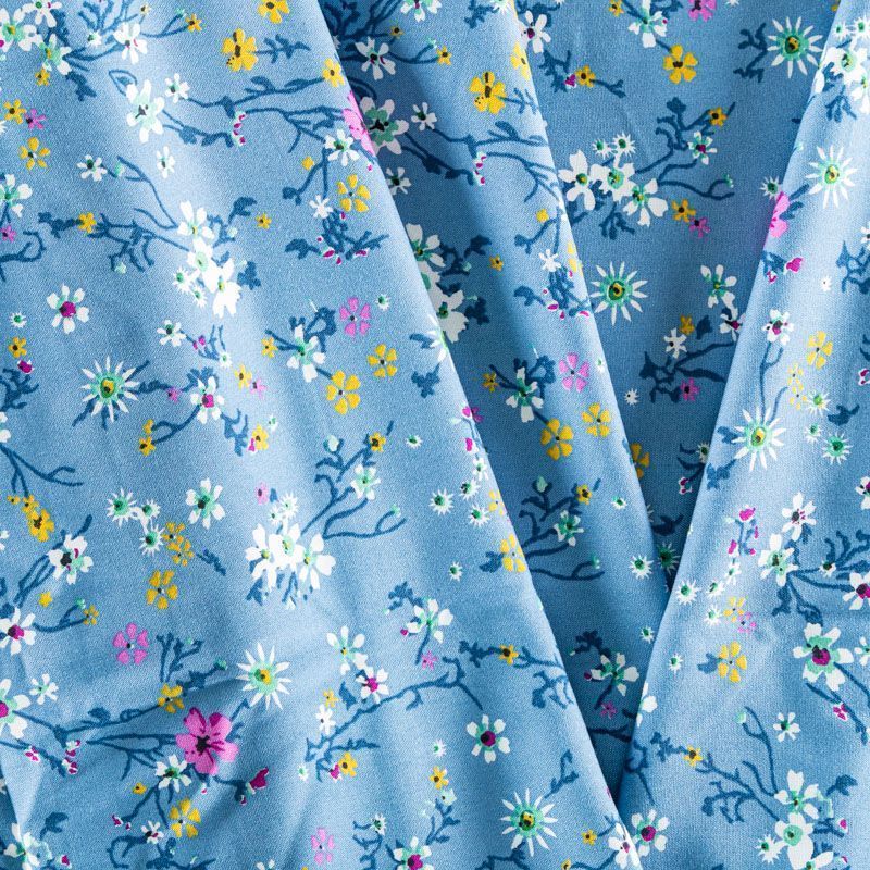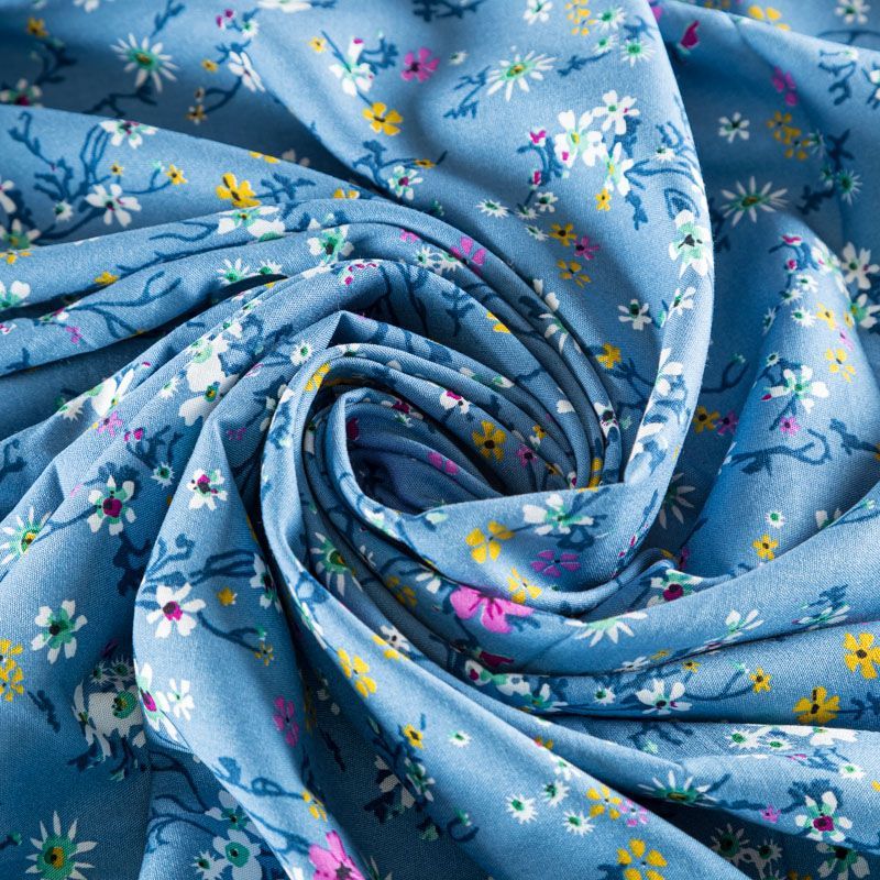 Плательно-блузочный штапель с мелким растительным принтом на сине-голубом фоне. Мягкий, тонкий, нежный, пластичный, приятный на ощупь, хорошо драпируется, практичный. Подойдет для пошива платья, топа, блузки, рубашки, юбки, летних брюк, комбинезона.