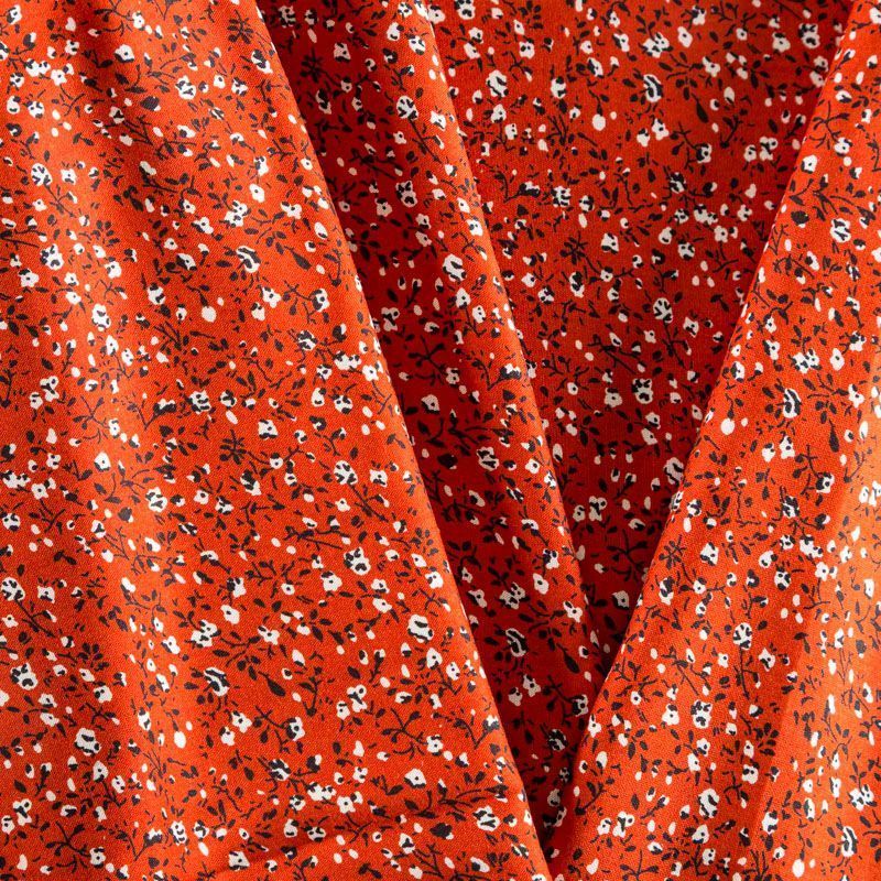 Плательно-блузочный штапель с мелким растительным принтом на темном апельсиновом фоне. Мягкий, тонкий, нежный, пластичный, приятный на ощупь, хорошо драпируется, практичный. Подойдет для пошива платья, топа, блузки, рубашки, юбки, летних брюк, комбинезона.