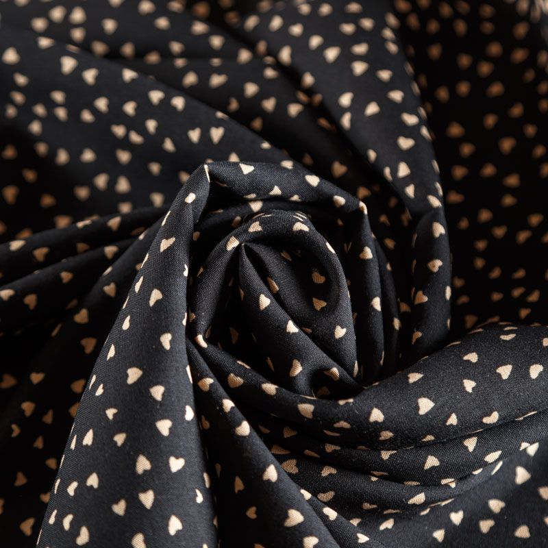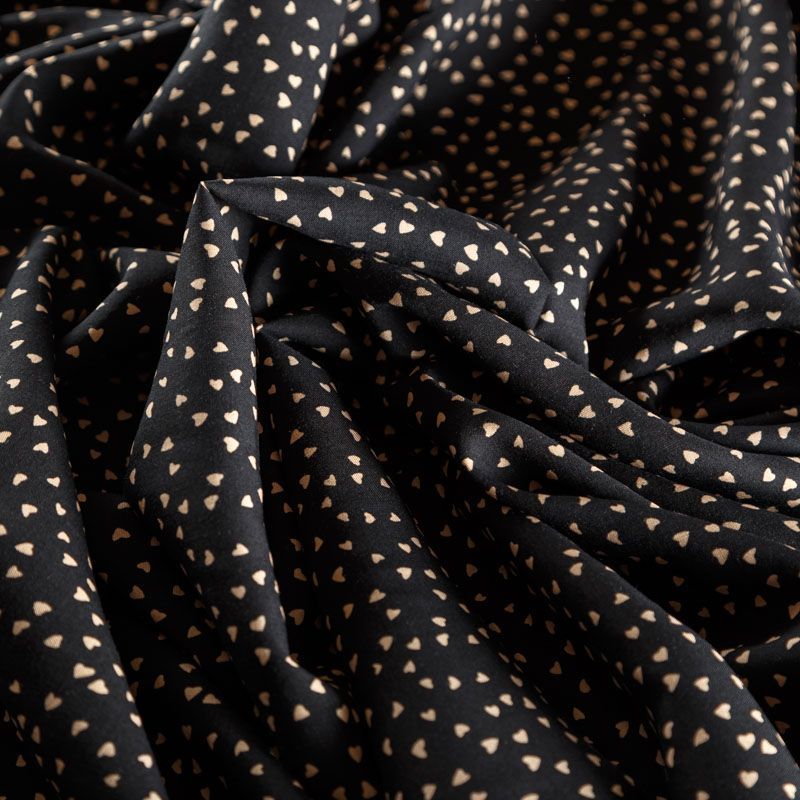 Плательно-блузочный штапель с мелким романтичным принтом в бежевом оттенке на черном фоне. Материал мягкий, тонкий, нежный, пластичный, приятный на ощупь, хорошо драпируется, практичный. Подойдет для пошива платья сарафана, топа, блузки, рубашки, юбки, летних брюк, комбинезона, а также домашней одежды.