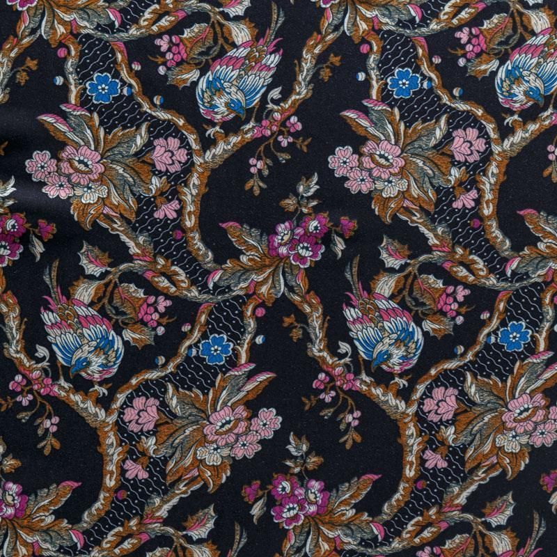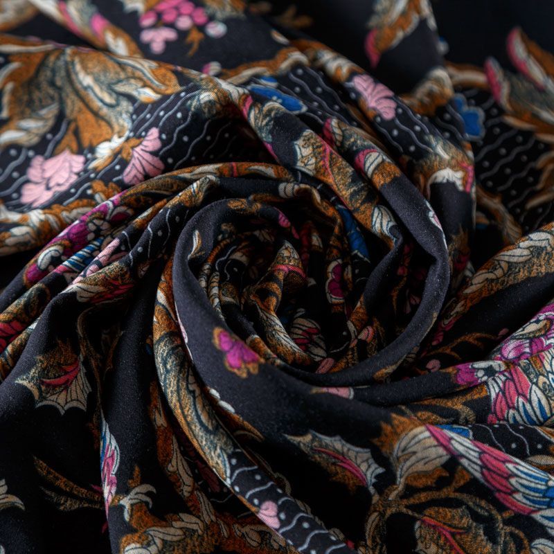 Плательно-блузочный штапель черного цвета с флористическим принтом. Ткань мягкая, тонкая, нежная и пластичная, приятная на ощупь, хорошо драпируется, практичная. Подойдет для пошива платья, топа, блузки, рубашки, юбки, летних брюк.