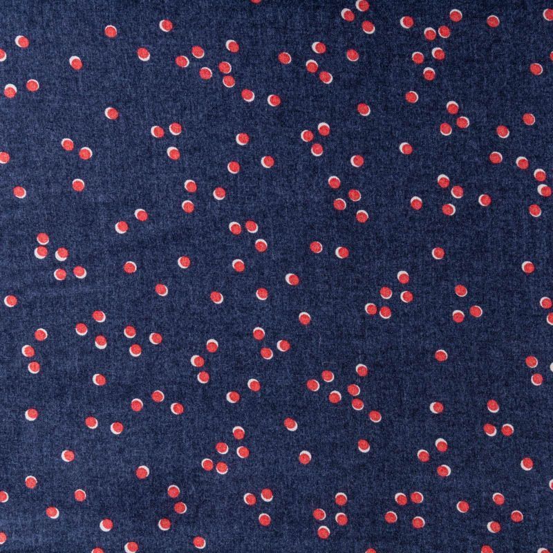Ткань легкая и пластичная, отлично собирается в мягкие складки, красиво струится. Поверхность гладкая и шелковистая, без блеска. Не просвечивается. Подойдёт для платья, блузки, пляжной туники, топа, летних сарафанов, летящей юбки. Мелкий хаотичный горошек молочно-кораллового цвета освежается спокойный темно-синий фон вискозы.