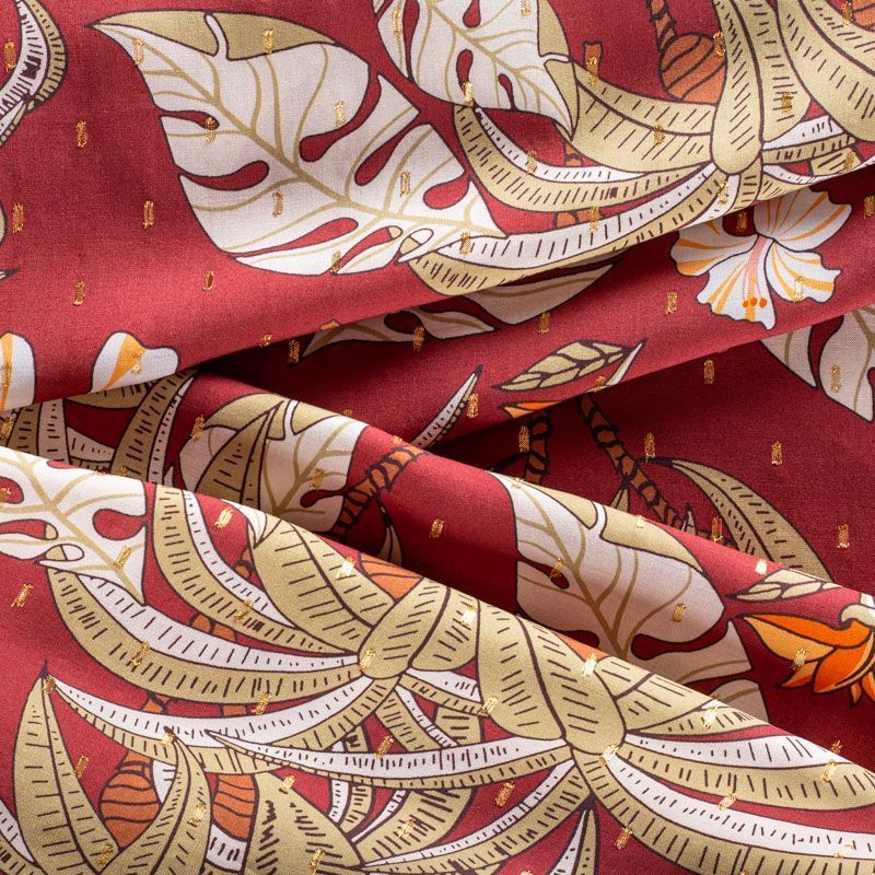 Плательно-блузочный штапель с фантазийным растительным принтом на терракотовом фоне декорирован ресничками из люрексовой нити. Мягкий, тонкий, нежный, пластичный, приятный на ощупь, хорошо драпируется, практичный. Подойдет для пошива платья, топа, блузки, рубашки, юбки, летних брюк.