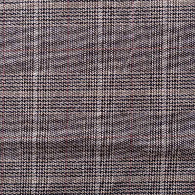 Итальянская костюмная ткань в клетку гленчек, которая образуется жаккардовым переплетением серых, бежевых и черных нитей. Ткань очень мягкая, приятная на ощупь, пластичная, хорошо драпируется. Отлично подойдет на костюмы, юбки, брюки, платья, жакеты.
