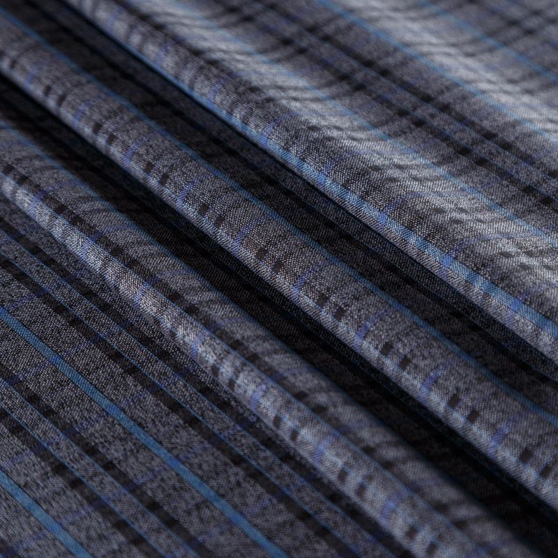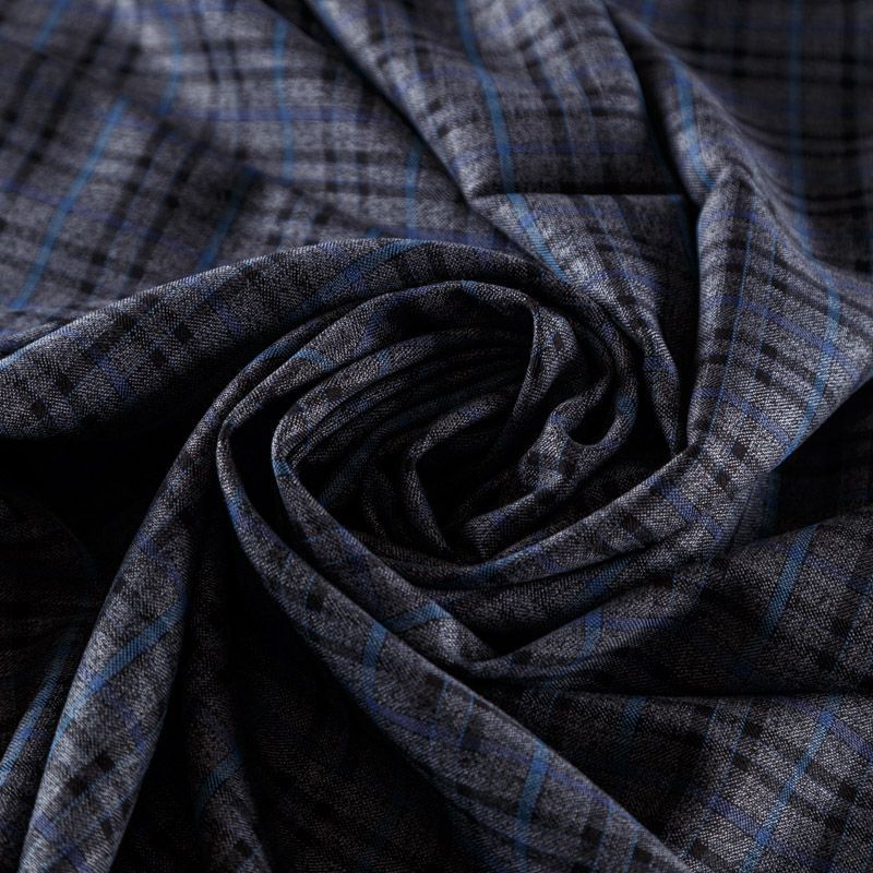 Костюмно-плательная ткань средней плотности, мягкая и приятная на ощупь, тянется за счет эластана в составе, формоустойчива, хорошо драпируется и образует устойчивые складки. Сочетание серого, синего и черного цветов образует сложную красивую клетку. Ткань отлично подойдет на костюмы, юбки, брюки, платья, жакеты, для пошива школьной формы.