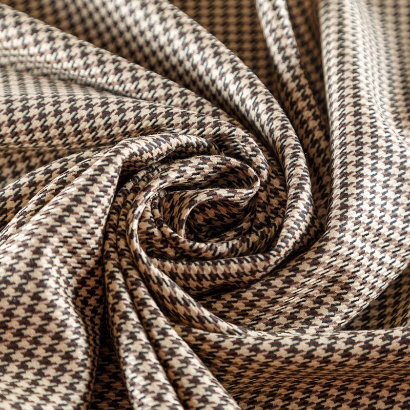 Итальянская костюмно-плательная шерсть средней плотности в актуальном бежевом цвете с классическим узором гусиная лапка в коричневых оттенках. Поверхность ткани имеет выраженное диагональное плетение, на ощупь гладкая, полированная благодаря содержанию шерсти ламы. Ткань очень мягкая, теплая, уютная, шерсть не колется, в носке очень комфортная. Подойдет для пошива стильного костюма, мужского пиджака, платья, жакета, юбки, шорт или легкого пальто для осенне-весеннего сезона.