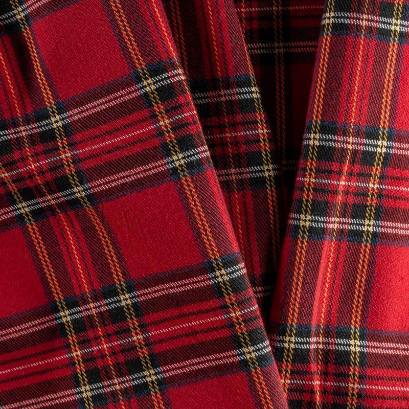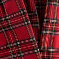 Ткань средней плотности, мягкая и приятная на ощупь, немного тянется, формоустойчива, хорошо драпируется и образует мягкие складки. Сочетание линий желтого, черного, синего и белого цветов на ярком красном фоне образует сложную красивую клетку тартан. Ткань отлично подойдет на костюмы, юбки, брюки, платья, жакеты.