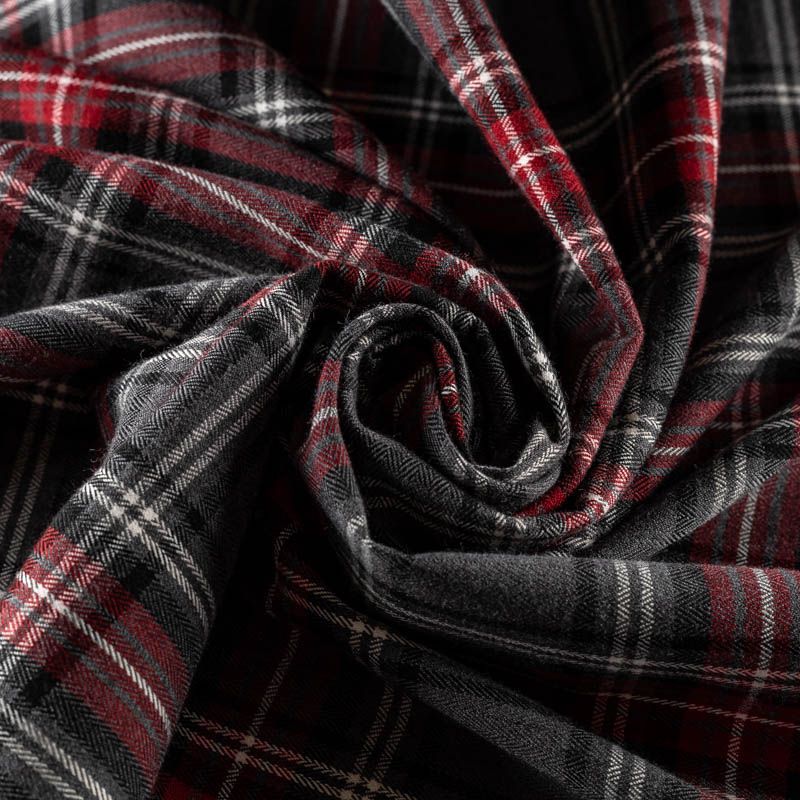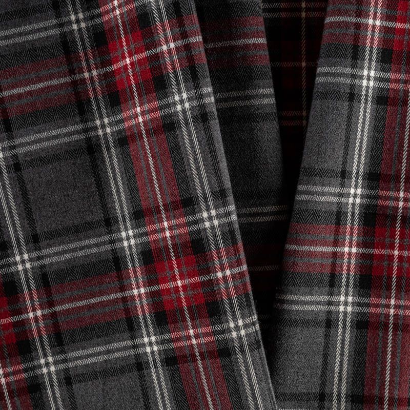 Ткань средней плотности, мягкая и приятная на ощупь, немного тянется, формоустойчива, хорошо драпируется и образует мягкие складки. Сочетание линий белого, черного и вишевого цветов на фактурном сером фоне образует сложную красивую клетку тартан. Ткань отлично подойдет на костюмы, юбки, брюки, платья, жакеты.