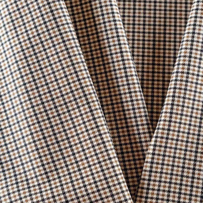 Костюмно-плательная поливискоза в бежевом оттенке в мелкую клетку. Ткань пластичная, очень приятная на ощупь, драпируется в слегка держащие форму складки. Подойдет для всех видов изделий - платьев, сарафанов, модных жакетов, жилетов, брючных и юбочных костюмов, кюлотов, брюк-палаццо, шорт, юбок различных фасонов.