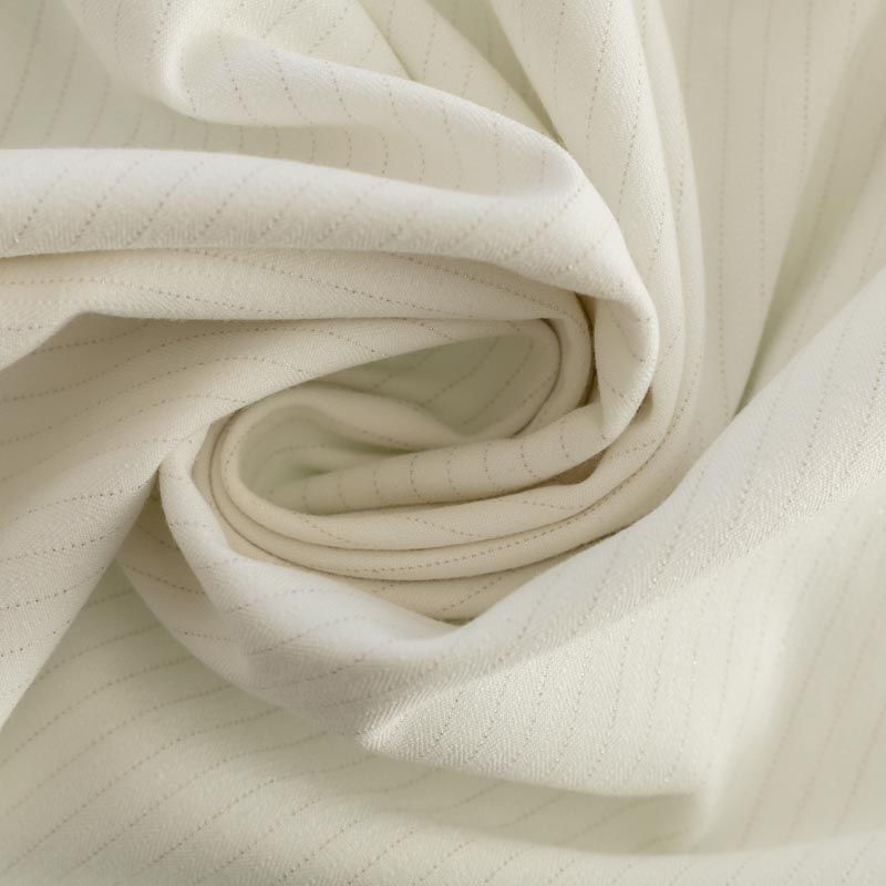 Достаточно плотная костюмно-плательная ткань, мягкая и приятная на ощупь, немного тянется, формоустойчива, хорошо драпируется и образует мягкие складки. Элегантный молочный цвет ткани украшает тончайшая золотистая люрексная вертикальная полоска. Ткань отлично подойдет на костюмы, юбки, брюки-палацио, платья, жакеты.