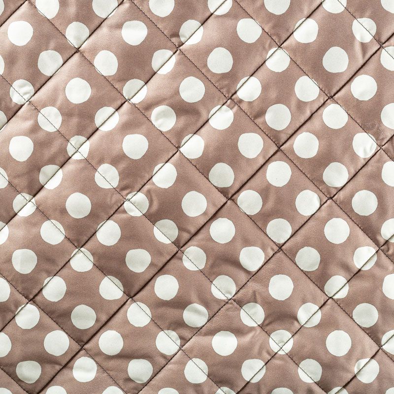 Трехслойная итальянская курточная ткань теплого серого оттенка в белый горох, простеганная не крупными ромбами размером 3х3 см. Нижний слой черного цвета, заменяет подклад, средний слой - синтепон, верхний слой - матовый полиэстер, напоминающий болонь. Ткань легкая, пластичная, хорошо драпируется. Прекрасно подойдет для пошива легких пальто, курток, бомберов, жилетов, накидок-кейпов, объемных сумок, одежды для домашних питомцев, туристического снаряжения.