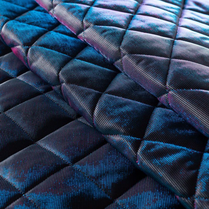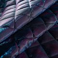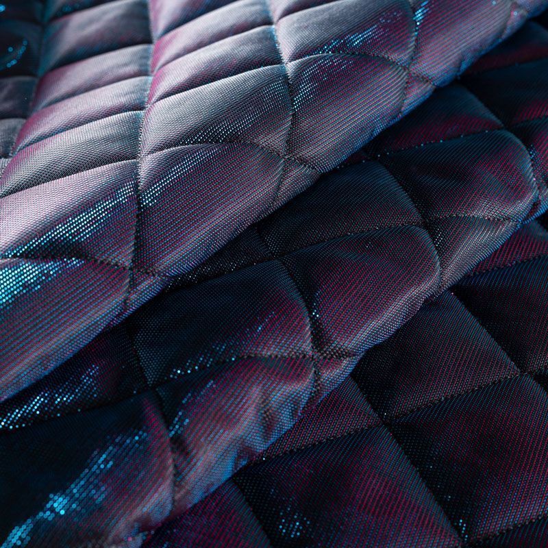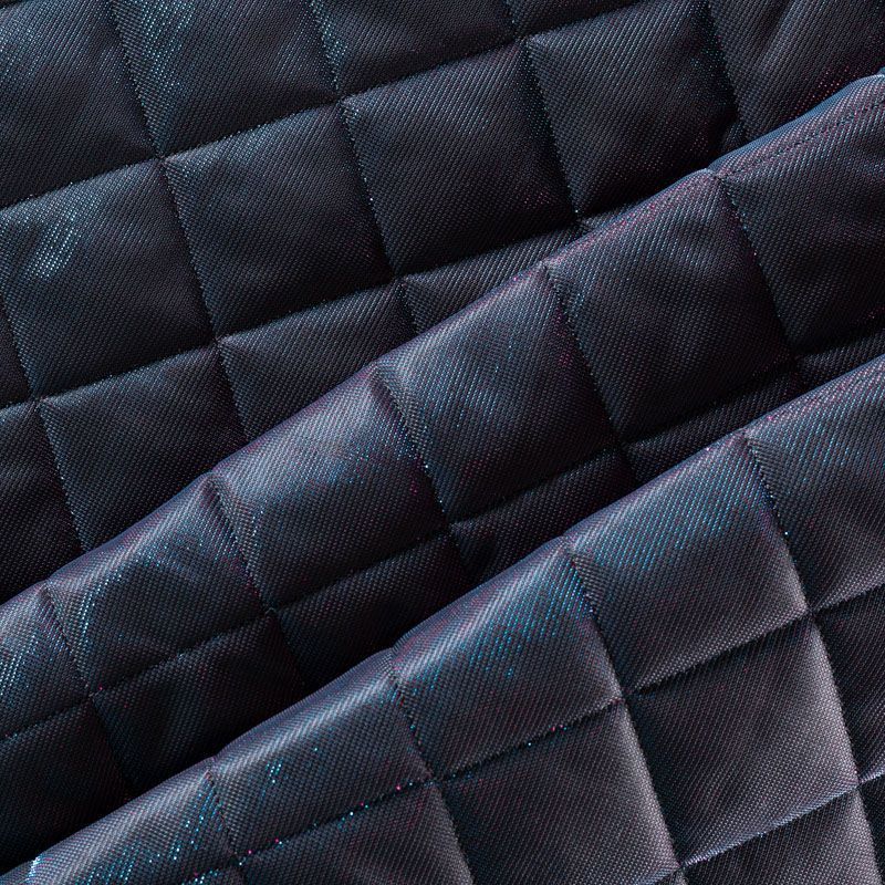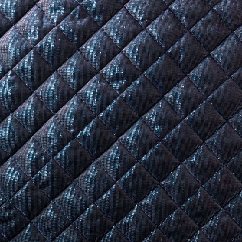 Трехслойная итальянская курточная ткань синего оттенка с эффектом металлик и хамелеон, простеганная не крупными ромбами размером 3х3 см. Нижний, черного цвета, заменяет подклад и верхний слой - фактурный полиэстер, между ними синтепон. Ткань легкая, пластичная, хорошо драпируется, красиво переливается и меняет оттенок на свету. Прекрасно подойдет для  пошива легких пальто, курток, бомберов, жилетов, накидок-кейпов, объемных сумок, одежды для домашних питомцев, туристического снаряжения.