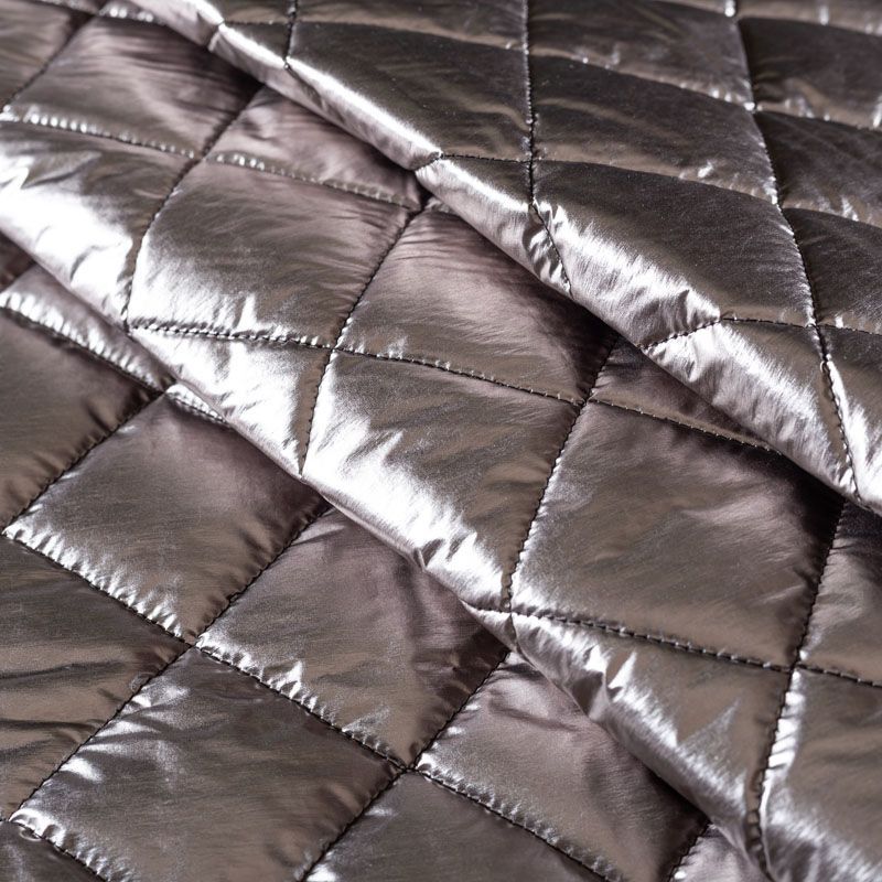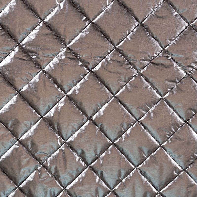 Трехслойная итальянская курточная ткань серебристо-бежевого оттенка с легким эффектом металлик, простеганная не крупными ромбами размером 3х3 см. Нижний, черного цвета, заменяет подклад и верхний слой - полиэстер, по качеству напоминает болонь, между ними синтепон. Ткань легкая, пластичная, хорошо драпируется. Прекрасно подойдет для  пошива легких пальто, курток, бомберов, жилетов, накидок-кейпов, объемных сумок, одежды для домашних питомцев, туристического снаряжения.