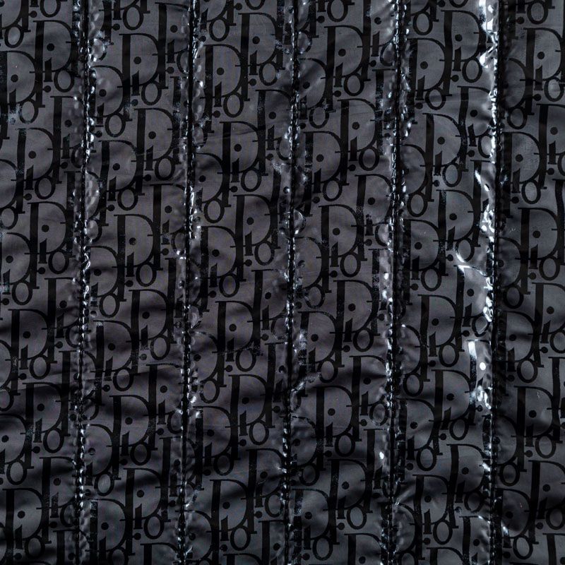 Итальянская двухслойная курточная ткань черного цвета с глитерным принтом лого известного бренда, простеганная вертикальными линиями вдоль кромки. Нижний слой - синтепон, верхний - полиэстер, по качеству напоминает болонь. Очень мягкая и легкая, пластичная, хорошо драпируется. Прекрасно подойдет для пошива легких пальто, курток, жилетов, накидок-кейпов, комбинезонов, объемных сумок, одежды для домашних питомцев, туристического снаряжения.