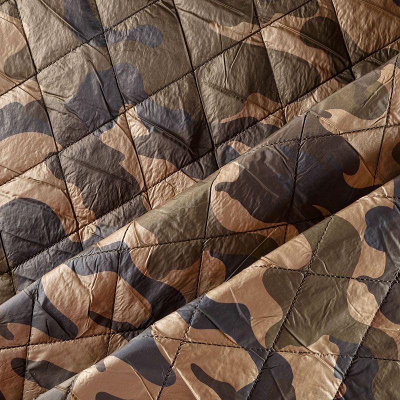 Двухслойная курточная ткань золотистого оттенка с оригинальным камуфлированным принтом, простеганная не крупными ромбами размером 4х4 см. Нижний слой - синтепон, верхний - полиэстер, по качеству напоминает болонь. Очень мягкая и легкая, пластичная, хорошо драпируется. Прекрасно подойдет для пошива легких пальто, курток, жилетов, накидок-кейпов, объемных сумок.