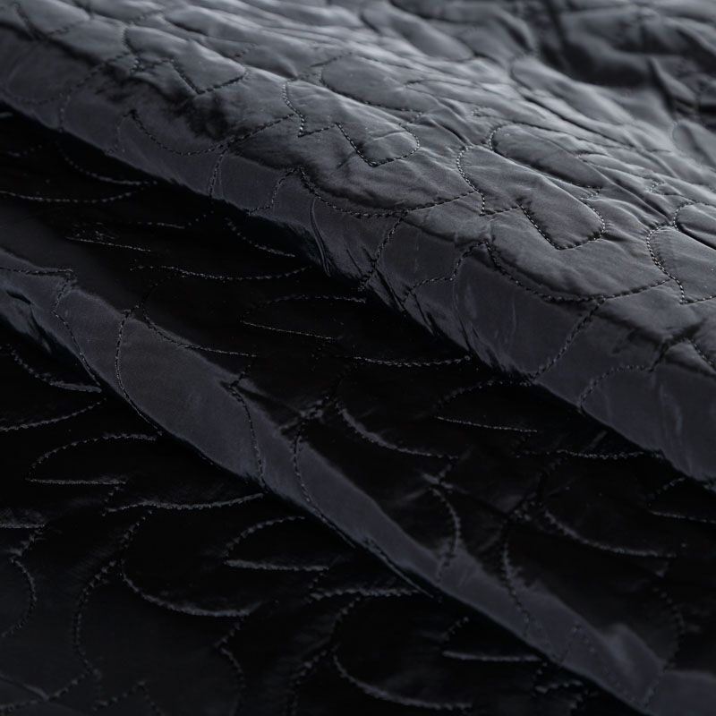 Двухслойная курточная ткань черного цвета, простеганная фигурной вышивкой нитками в тон. Нижний слой - синтепон, верхний - плотный матовый полиэстер. Очень мягкая и легкая, пластичная, хорошо драпируется. Прекрасно подойдет для  пошива легких пальто, курток, жилетов, накидок-кейпов, объемных сумок.
