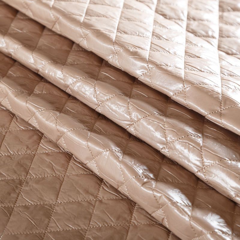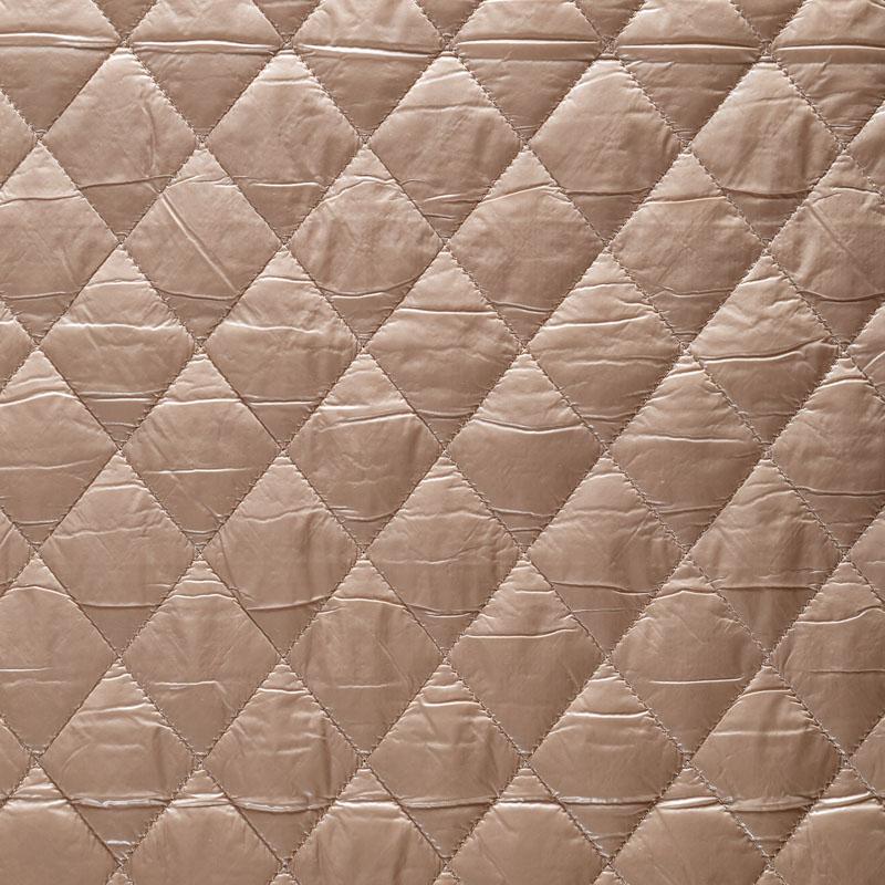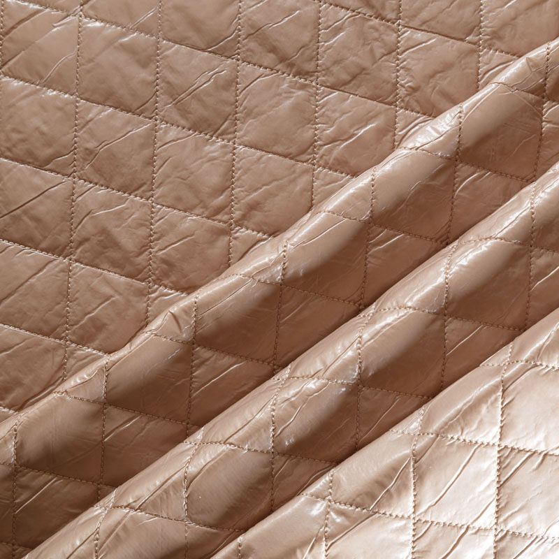 Трехслойная курточная ткань бежевого оттенка, простеганная не крупными ромбами. Нижний слой - матовый фактурный полиэстер, средний - тонкий синтепон, верхний - глянцевая гладкая плащевка. Очень мягкая и легкая, пластичная, хорошо драпируется. Прекрасно подойдет для  пошива легких пальто, бомберов, парки, курток, жилетов, накидок-кейпов, объемных сумок.