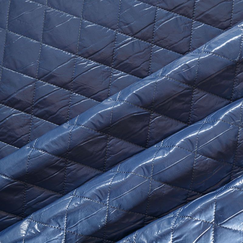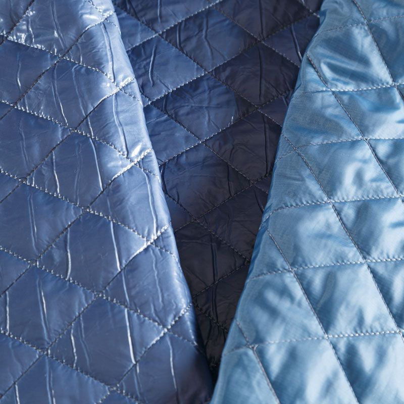 Трехслойная курточная ткань голубого оттенка, простеганная не крупными ромбами. Нижний слой - матовый фактурный полиэстер, средний - тонкий синтепон, верхний - глянцевая гладкая плащевка. Очень мягкая и легкая, пластичная, хорошо драпируется. Прекрасно подойдет для пошива легких пальто, бомберов, парки, курток, жилетов, накидок-кейпов, объемных сумок.