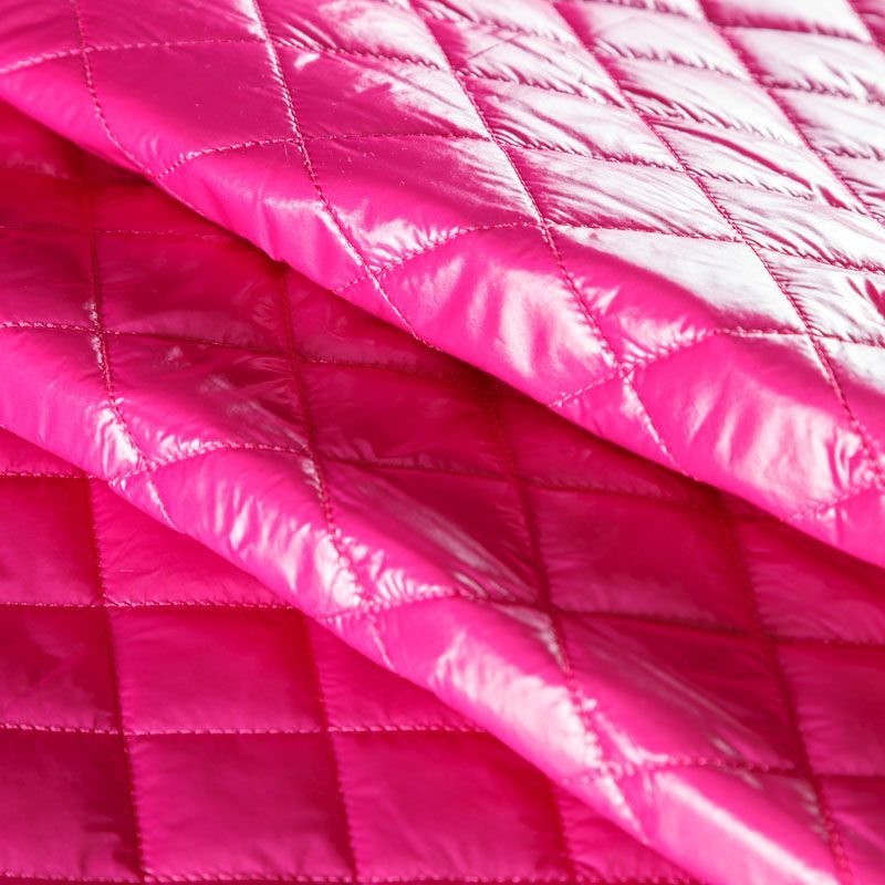 Трехслойная курточная стежка ярко-розового цвета, простеганная не крупными ромбами. Верхний слой - полиэстер, по качеству напоминающий болонь, средний слой - синтепон, нижний слой - подкладочная ткань в тон лицевой. Очень мягкая и легкая, пластичная, хорошо драпируется. Прекрасно подойдет для пошива легких пальто, курток, жилетов, накидок-кейпов, объемных сумок.