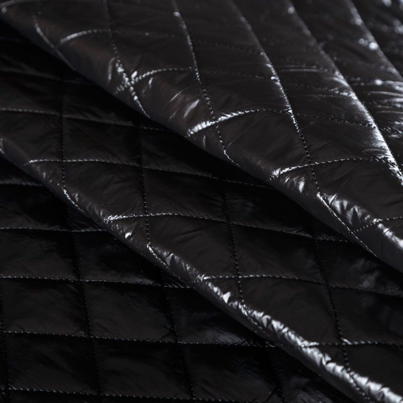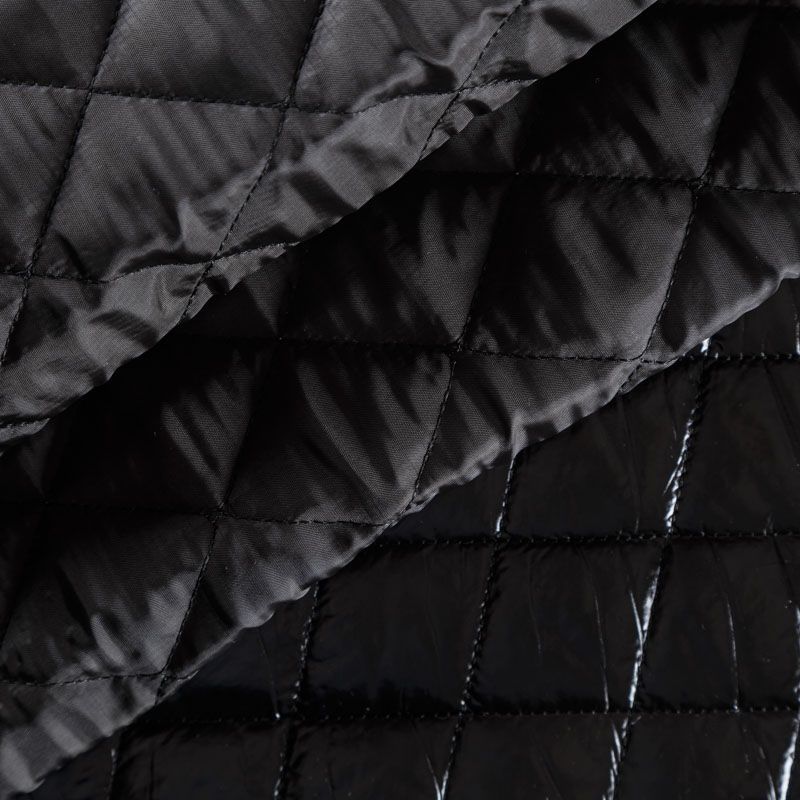 Трехслойная курточная стежка черного цвета, простеганная не крупными ромбами. Верхний слой - полиэстер, по качеству напоминающий болонь, средний слой - синтепон, нижний слой - подкладочная ткань в тон лицевой. Очень мягкая и легкая, пластичная, хорошо драпируется. Прекрасно подойдет для пошива легких пальто, курток, жилетов, накидок-кейпов, объемных сумок.