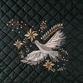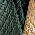 Курточный купон на синтепоне и подкладке, простеганный не крупными ромбами размером 3,5х3,5 см. С лицевой стороны тонкая, но прочная плащевая ткань с фантазийной вышивкой, с изнаночной - желто-бежевая ткань с полоску. Материал мягкий, объемный и "воздушный", хорошо держит форму и подойдет для пошива легких пальто, курток, жилетов, накидок-кейпов, парки.