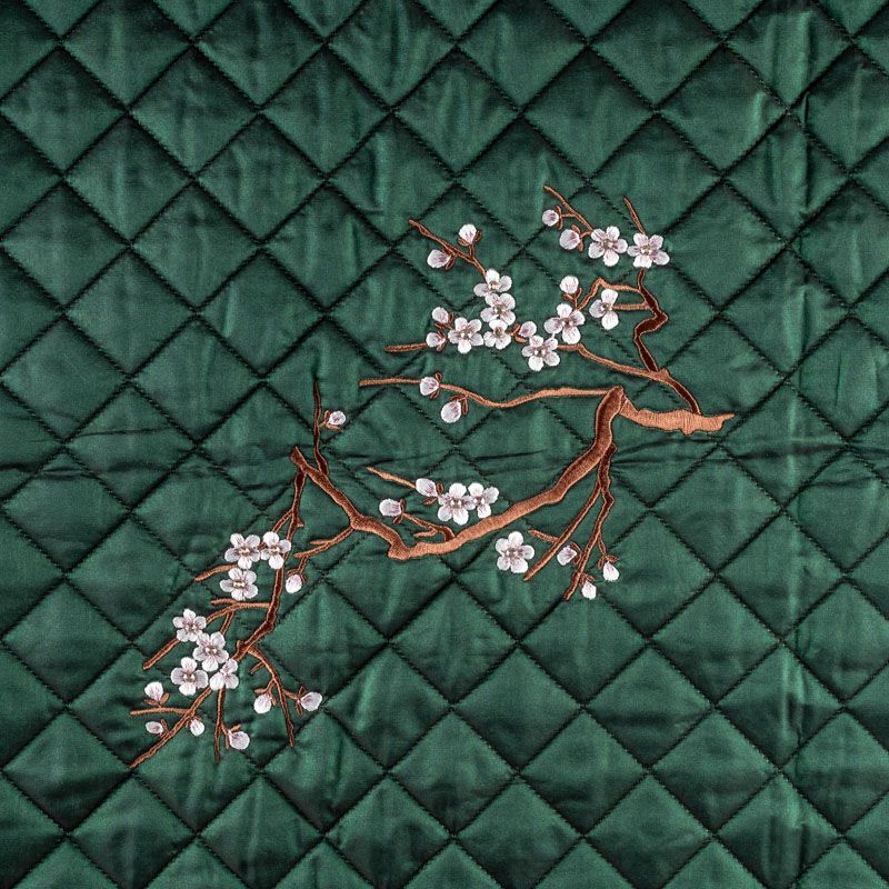 Курточный купон на синтепоне и подкладке, простеганный не крупными ромбами размером 3,5х3,5 см. С лицевой стороны тонкая, но прочная плащевая ткань с вышивкой в виде цветущей ветки сакуры, с изнаночной - желто-бежевая ткань с полоску. Материал мягкий, объемный и "воздушный", хорошо держит форму и подойдет для пошива легких пальто, курток, жилетов, накидок-кейпов, парки.