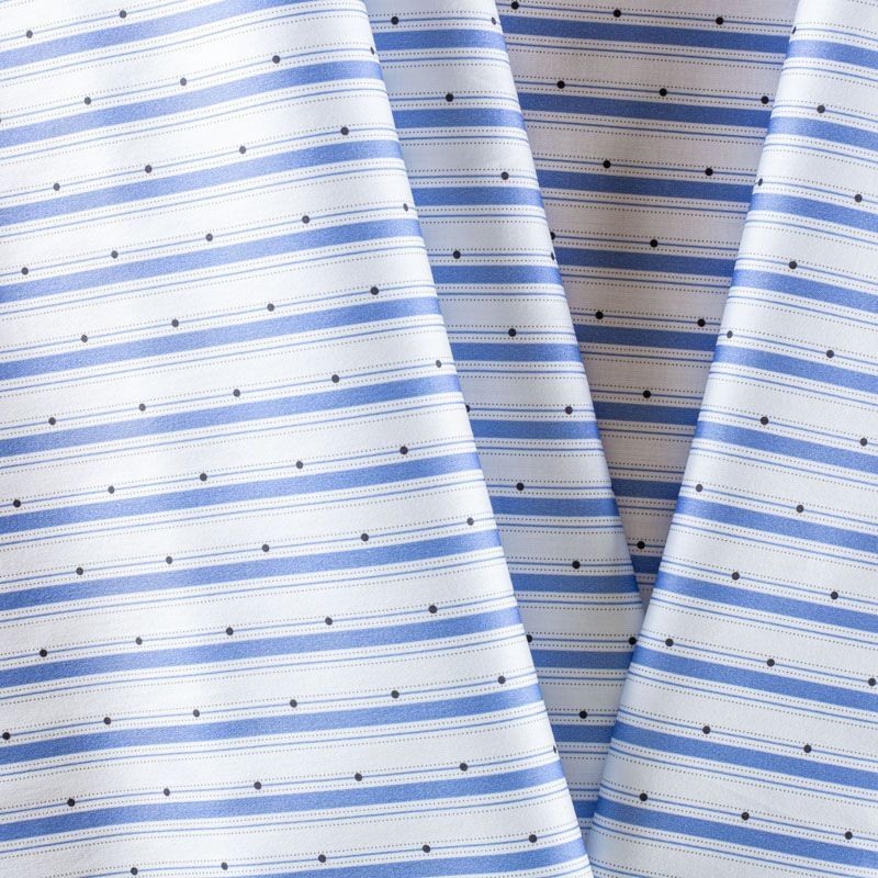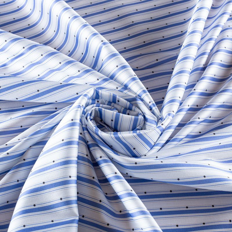 Итальянский плательно-рубашечный хлопок с эластаном в полоску оттенка синего денима. Ткань мягкая, лёгкая, непрозрачная, пластичная и приятная к телу, хорошо драпируется, тянется, имеет гладкую матовую поверхность и сатиновое плетение. Прекрасно подойдет как для пошива платья-рубашки, сарафана, платьев различных фасонов, туники, топа, летнего костюма, комбинезона.