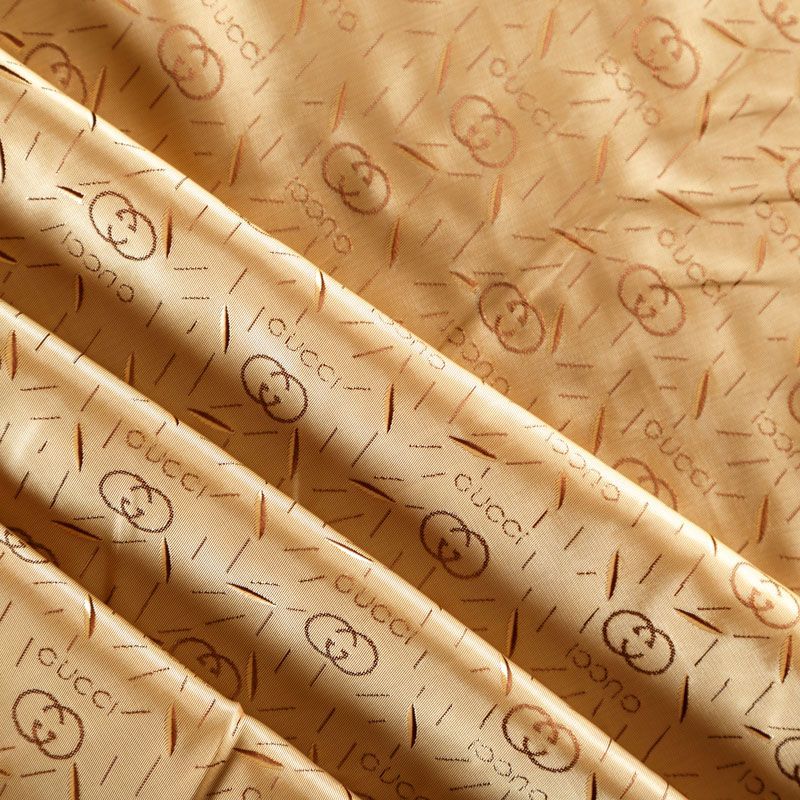 Смесовая подкладочная ткань желтого оттенка с жаккардовым узором и красивым лоском. Полотно средней плотности, легкое, не просвечивает, хорошо скользит, не тянется. Подойдет для изготовления таких изделий, как пальто, костюмы, куртка, шуба, платье, жакет.
