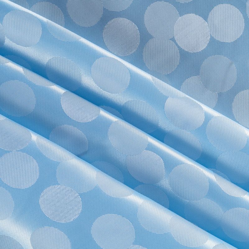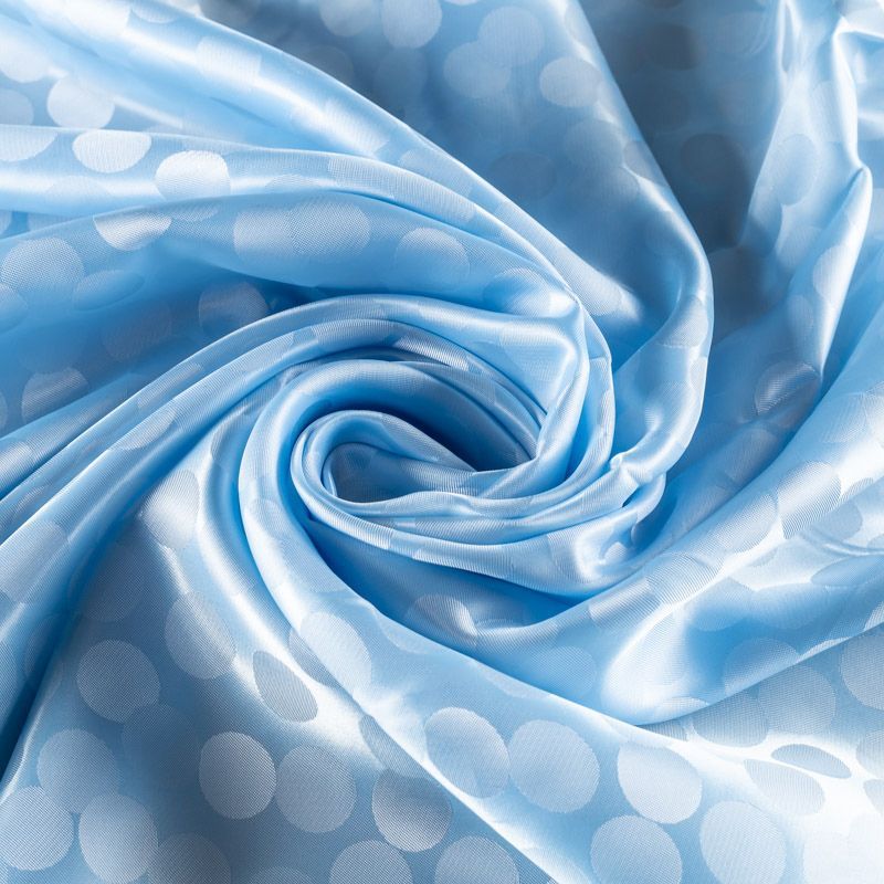Подкладочная ткань легкая, с жаккардовым крупным "горохом", голубого оттенка, с красивым блеском. Не просвечивает, хорошо скользит. Подойдет для изготовления таких изделий, как пальто, костюмы, куртка, шуба, платье, жакет.