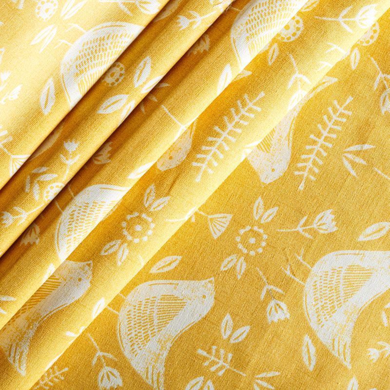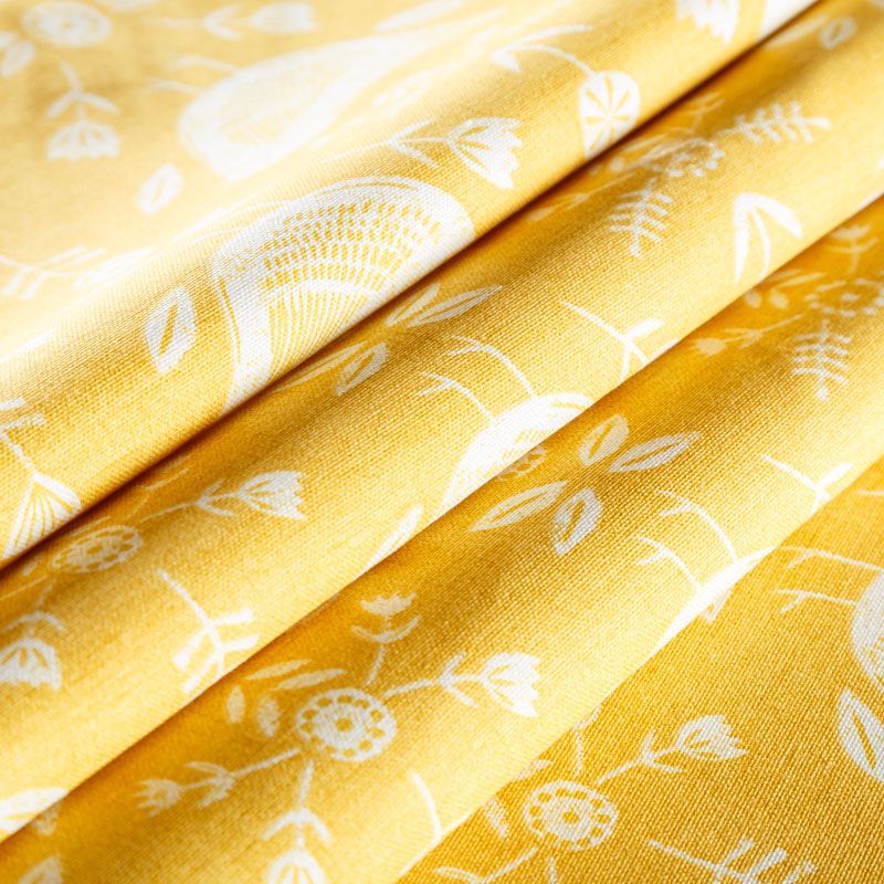 Хлопковая портьерная ткань Нарвик из коллекции Сканди английского производителя Fryett's Fabric. На желтой текстурированной основе наснесен принт в виде белых стилизованных птиц и цветов. Ткань средней плотности, прекрасно держит форму, драпируется в устойчивые складки. Подойдет для классических портьер, римских штор, покрывал, подушек, скатертей, салфеток и других элементов текстильного интерьера как в самостоятельном исполнении, так и качестве компаньона к однотонным варинтам.