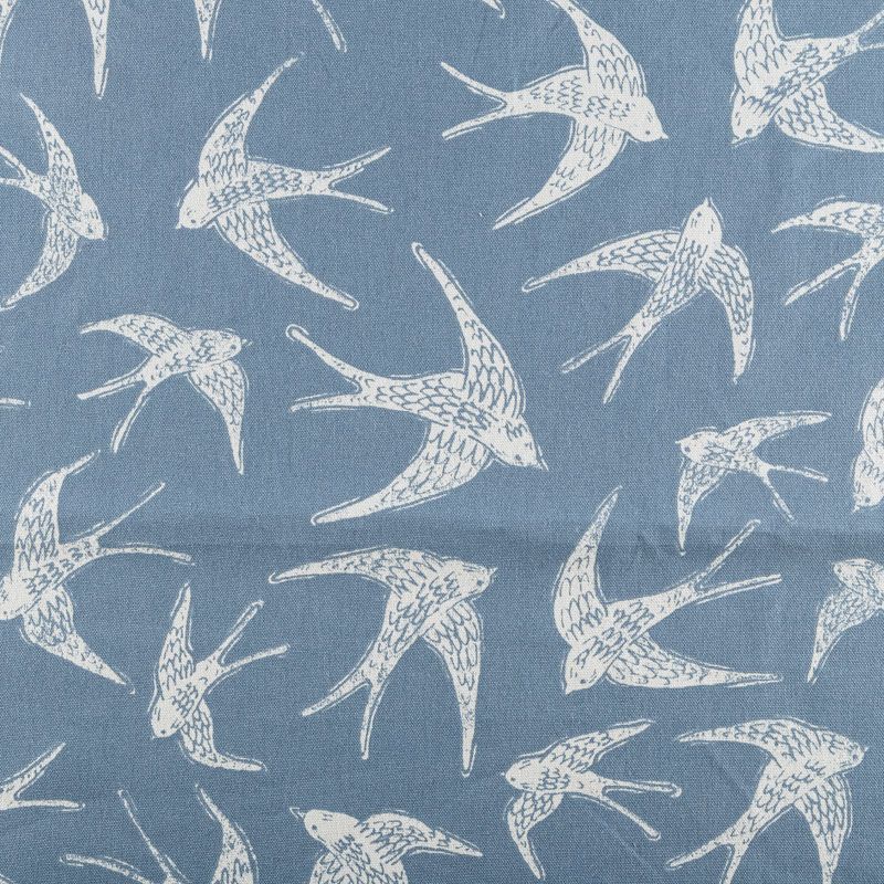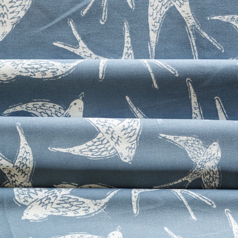 Матовая фактурная портьерная ткань синего оттенка с весенним принтом в виде ласточек. Ткань средней плотности, без блеска, хорошо драпируется, имеет полонтяное переплетение. Прекрасно впишется в самые разные стилевые направления (прованс, кантри). Можно использовать для пошива портьер, римской шторы, салфеток, столового белья, подушек, покрывал и других предметов текстильного интерьера.