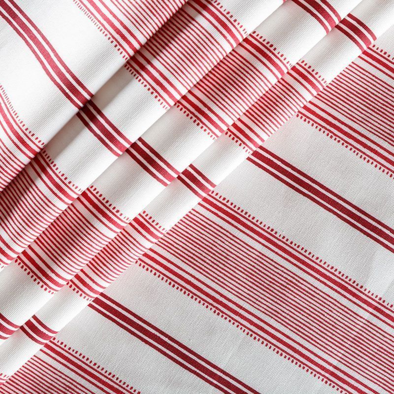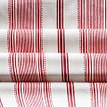 Матовая фактурная портьерная ткань в тонкую полоску, которая расположена вдоль кромки. Представлена в бело-красной палитре. Ткань средней плотности, без блеска, хорошо драпируется, имеет полонтяное переплетение. Прекрасно впишется в самые разные стилевые направления (прованс, кантри). Можно использовать для пошива портьер, римской шторы, салфеток, столового белья, подушек, покрывал и других предметов текстильного интерьера.