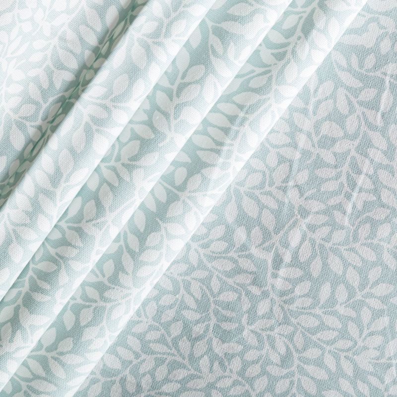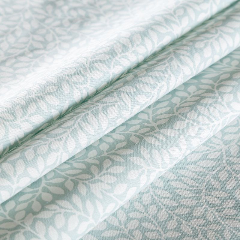 Хлопковая портьерная ткань со стилизованным растительным принтом в молочном оттенке на светло-бирюзовом фоне. Ткань средней плотности, без блеска, хорошо драпируется, имеет полонтяное переплетение. Можно использовать для пошива портьер, римской шторы, салфеток, столового белья, подушек, покрывал и других предметов текстильного интерьера.