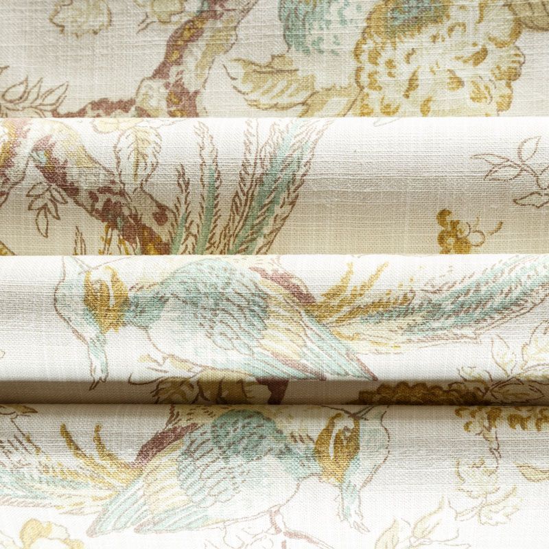 Элегантная ткань из коллекции Ренессанс известного бренда Fryett's с тропическим рисунком, выполненным в мельчайших деталях, нанесенных на текстурированную хлопковую основу. Ткань средней плотности, прекрасно держит форму, драпируется в устойчивые складки. Подойдет для плотных штор, покрывал, подушек, скатертей, салфеток  и других элементов текстильного интерьера как в самостоятельном исполнении, так и качестве компаньона к цветным варинтам.
