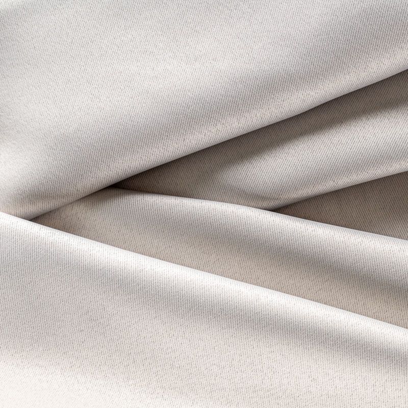 Двухстороняя плотная ткань. Обе стороны гладкие, имеют сатиновый легкий глянец. Ткань хорошо драпируется, укладываясь в крупные ниспадающие пластичные складки и позволяет использовать любые виды крепления для штор – люверсы, ленту, кольца.  Блокирует от 50 до 90 % проникновение света в помещении, не склонна к выгоранию и деформации. Удачно впишется в такие интерьеры, как эко, лофт, модерн в качестве портьер и других элементов текстильного оформления.