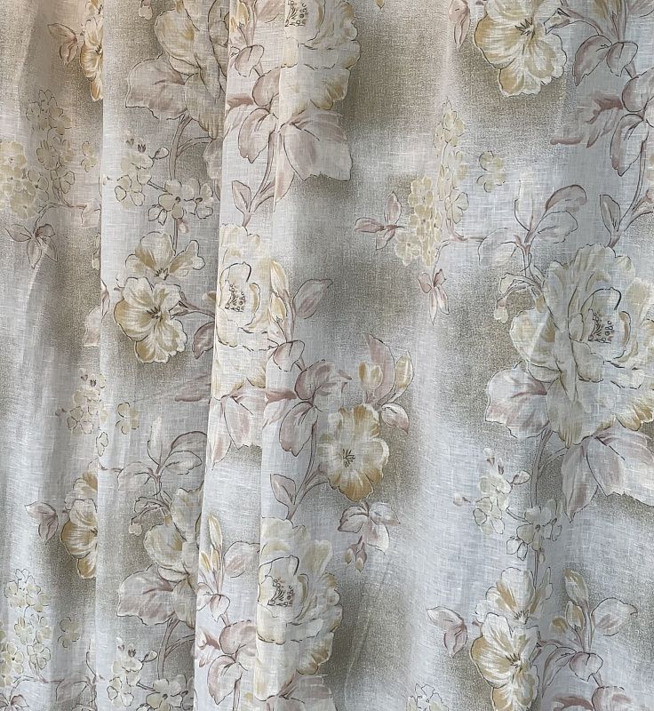Итальянская портьерная льняная ткань в натуральных оттенках с крупным флористическим принтом в пастельным тонах. Неповторимая природная фактура льна и оптимальная длина ткани позволит использовать их в любой комнате дома - гостиной, столовой, спальне, кухне - как самостоятельный элемент декора, так и в сочетании с тюлем.