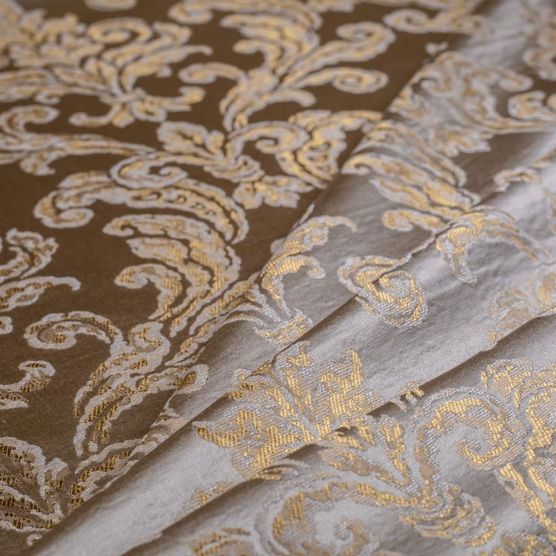 Итальянская жаккардовая портьерная ткань с добавлением натурального шелка в благородной золотистой цветовой гамме с цветочно-растительным орнаментом. Ткань хорошо драпируется. Будет уместна в декорировании интерьеров в стилях ар-деко, стилизованная классика, модерн. Подходит для пошива штор, ламбрекенов, покрывал, наволочек, чехлов на мебель и других элементов декора.