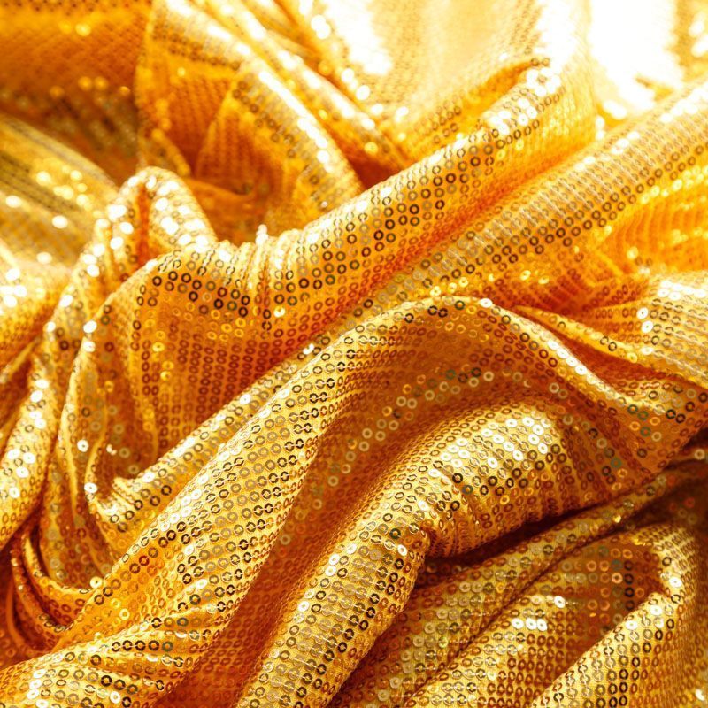 Блестящие пайетки в золотом цвете. Мелкие, размером около 2 мм. Основа - "холодное" тонкое трикотажное полотно, комфортное в носке. Ткань не прозрачная, тянется.  Подойдет для вечернего, коктельного платья или юбки, комбинезона, топа, танцевальных и сценических костюмов.