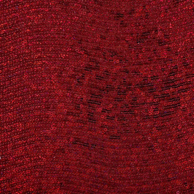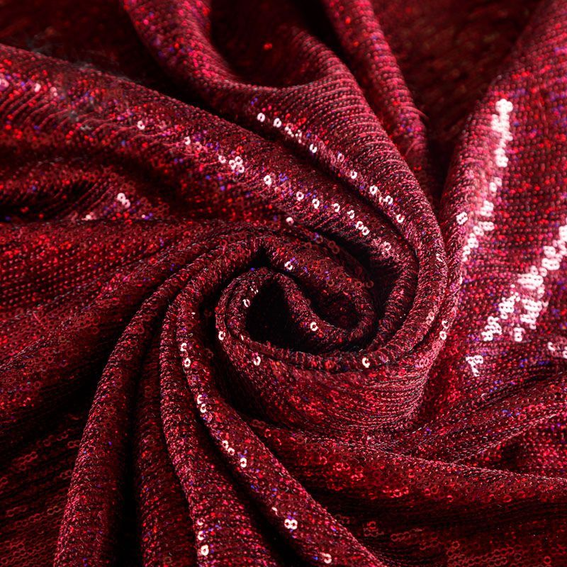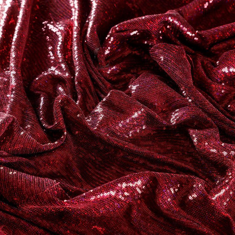 Эластичная сетка бордового оттенка по всей поверхности которой расположены глянцевые пайетки. Ткань очень хорошо драпируется, красиво переливается, имеет глянцевый блеск, пластичная, полоски расположены вдоль кромок, которые обработаны вышитым фигурным фестоном, набирается объемом,  Пайетки — идеальный материал для праздников и вечеринок. Из них получится эффектное платье, жакет, боди, туника, юбка или комбинезон.