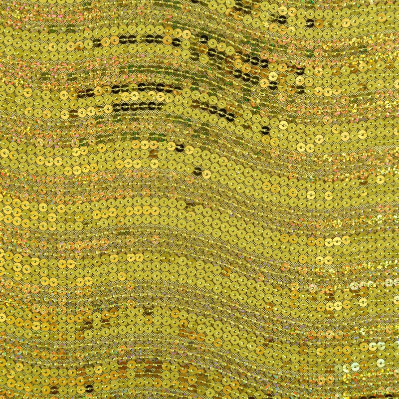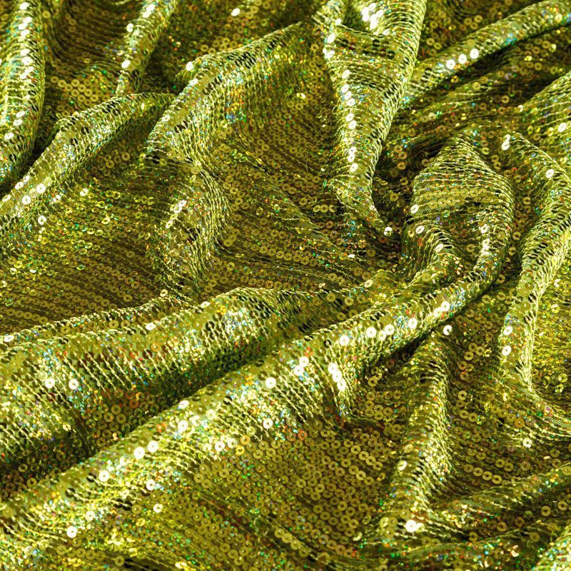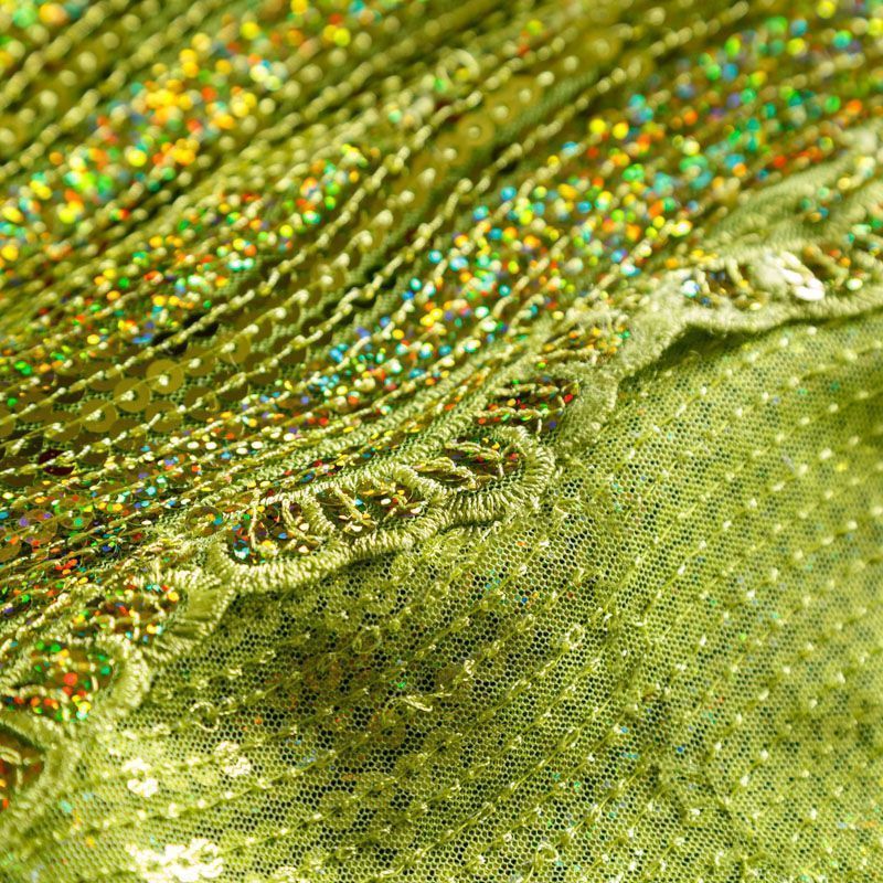 Эластичная сетка желто-зеленого оттенка по всей поверхности которой расположены глянцевые пайетки. Ткань очень хорошо драпируется, красиво переливается, имеет глянцевый блеск, пластичная, полоски расположены вдоль кромок, которые обработаны вышитым фигурным фестоном, набирается объемом,  Пайетки — идеальный материал для праздников и вечеринок. Из них получится эффектное платье, жакет, боди, туника, юбка или комбинезон.