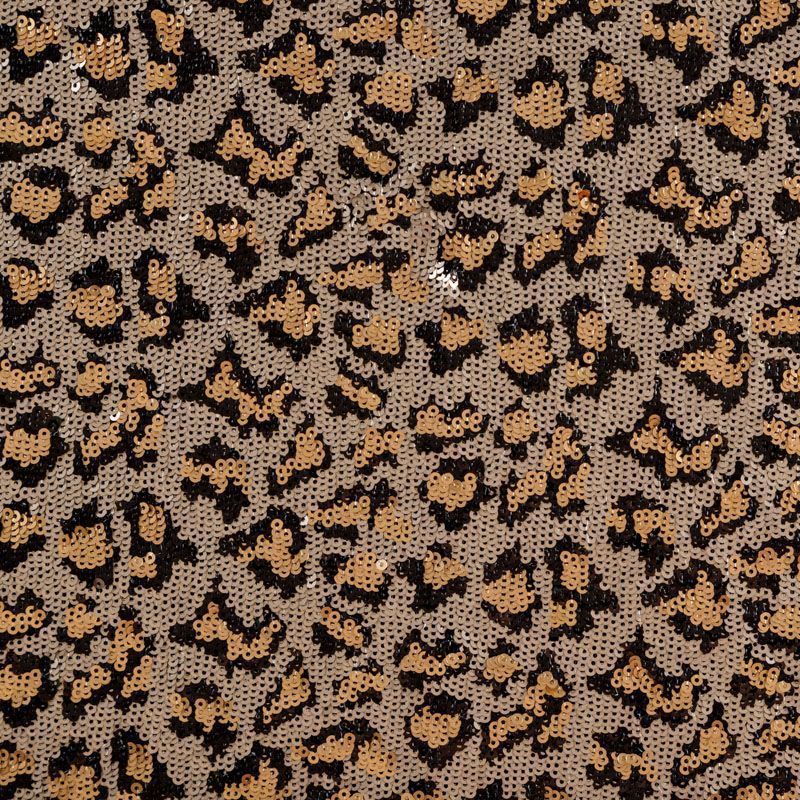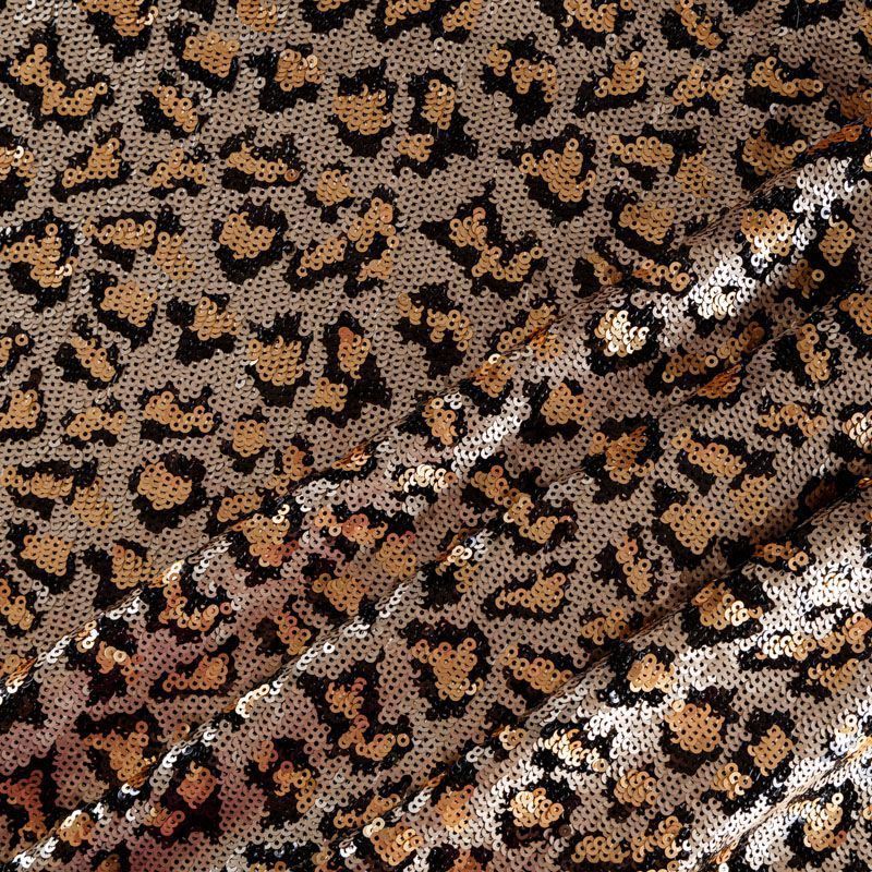 Пайетки с анималистическим узором в золотисто-черной гамме. Вышиты на черной эластичной сетке. Роскошно смотрится в блестящих нарядных комбинезонах, сверкающих платьях и искрящихся блузках, юбках, туниках, концертных костюмах, нарядах для танцев. На ощупь полотно не тяжелое, достаточно пластичное и удобное в носке.