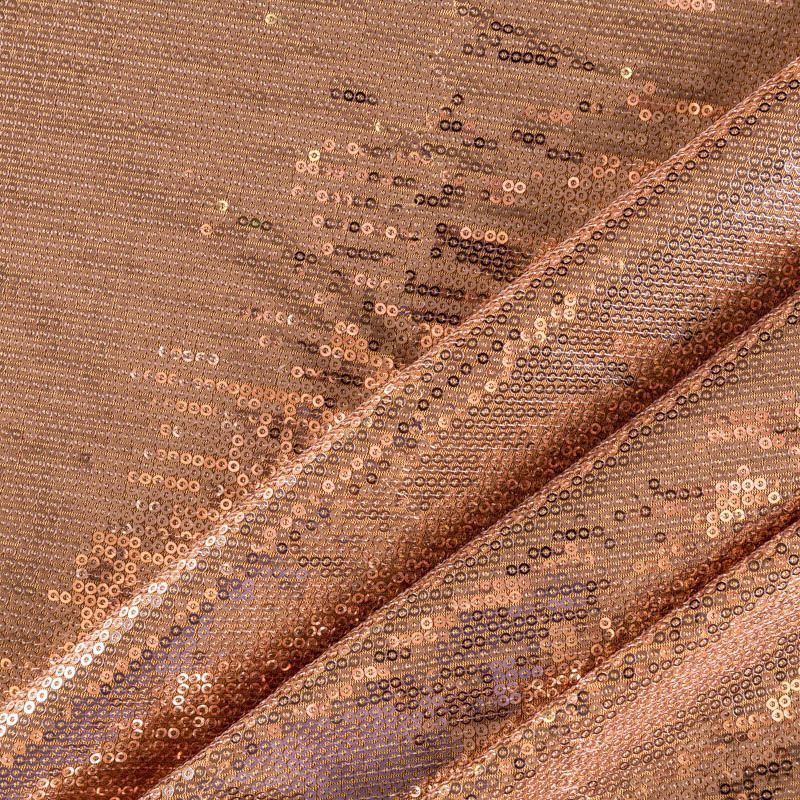 Блестящие пайетки бронзового оттенка. Мелкие, размером около 3 мм. Основа - трикотажное полотно, комфортное в носке. Ткань не прозрачная, тянется. Подойдет для вечернего коктельного платья или юбки, комбинезона, топа, танцевальных и сценических костюмов.