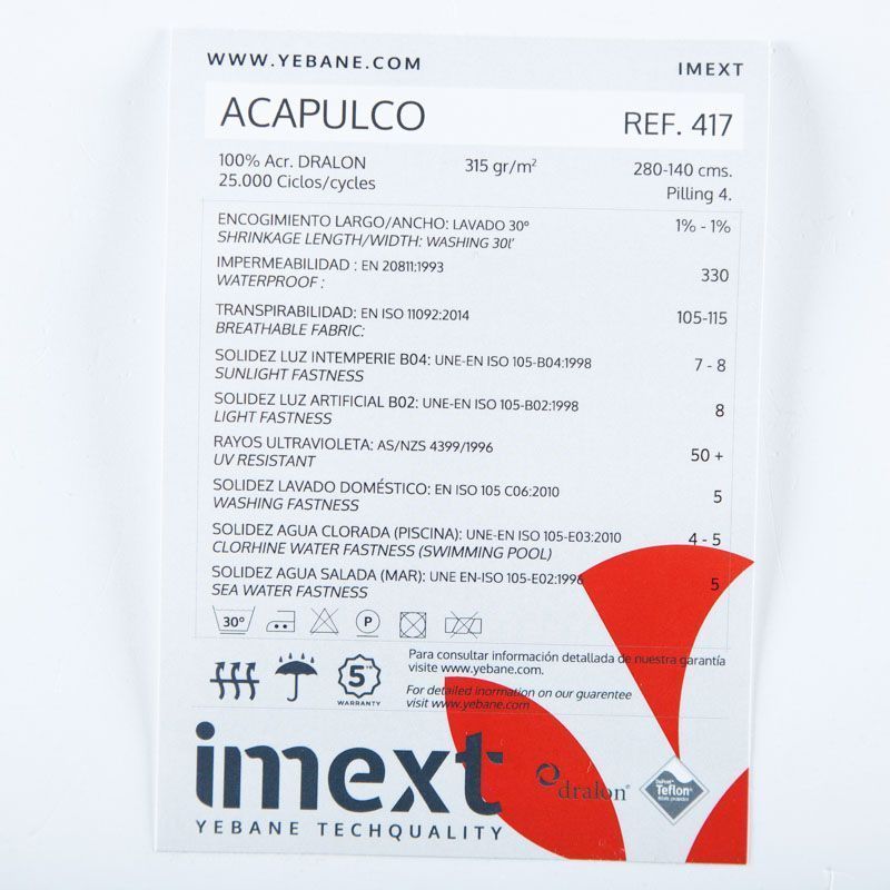 Прочная, надежная, износоустойчивая акриловая ткань Dralon от испанского производителя Yebane из коллекции Imext (Outdoor) предназначена для применения в экстремальных погодных условиях. Материал подходит для оформления уличных беседок, летних площадок кафе, разноплановых тентов. Также ткань широко применима в пошиве мягких элементов для садовой мебели. Ткани для улицы дополнительно обработаны пропиткой Teflon, что придает им водо-, грязе- отталкивающие свойства. Материал легко очищается от грязи, быстро сохнет после намокания, не задерживает излишки влаги, хорошо вентилируется, не накапливая посторонние запахи.