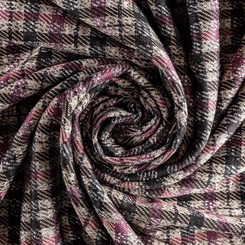 Плотный вязаный трикотаж с вискозой. Сочетание линий черного, серого и террактового оттенков образует сложную красивую клетку. Материал мягкий, пластичный, хорошо тянется, практически не просвечивает и отлично подходит для изготовления платья, юбки, жакета или кардигана.