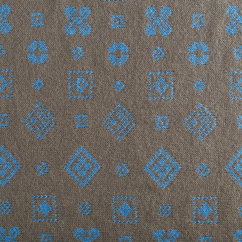 Итальянский теплый мягкий вязаный шерстяной трикотаж, два слоя которого соединены между собой жаккардовым геометрическим узором. Полотно очень пластичное, приятное на ощупь, не колется. При соответствующей обработке швов одежду из этого трикотажа можно носить на обе стороны. Подойдет для пошива теплых уютных свитеров, кардиганов, пальто, костюмов, теплого платья, свитшота, джемпера.