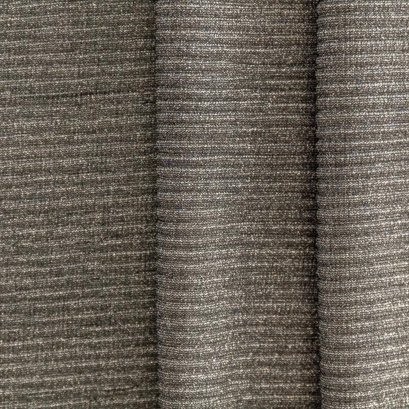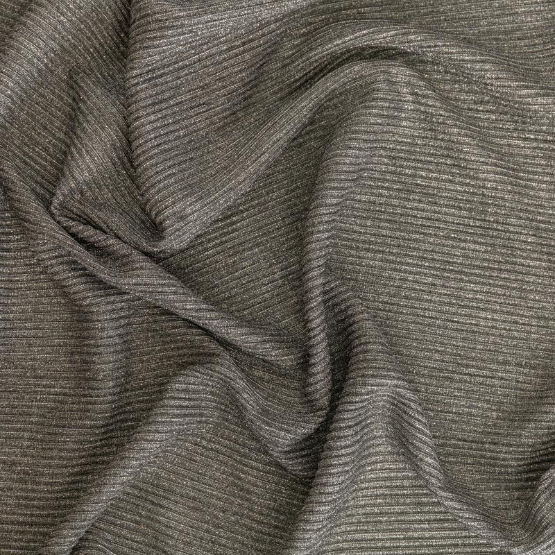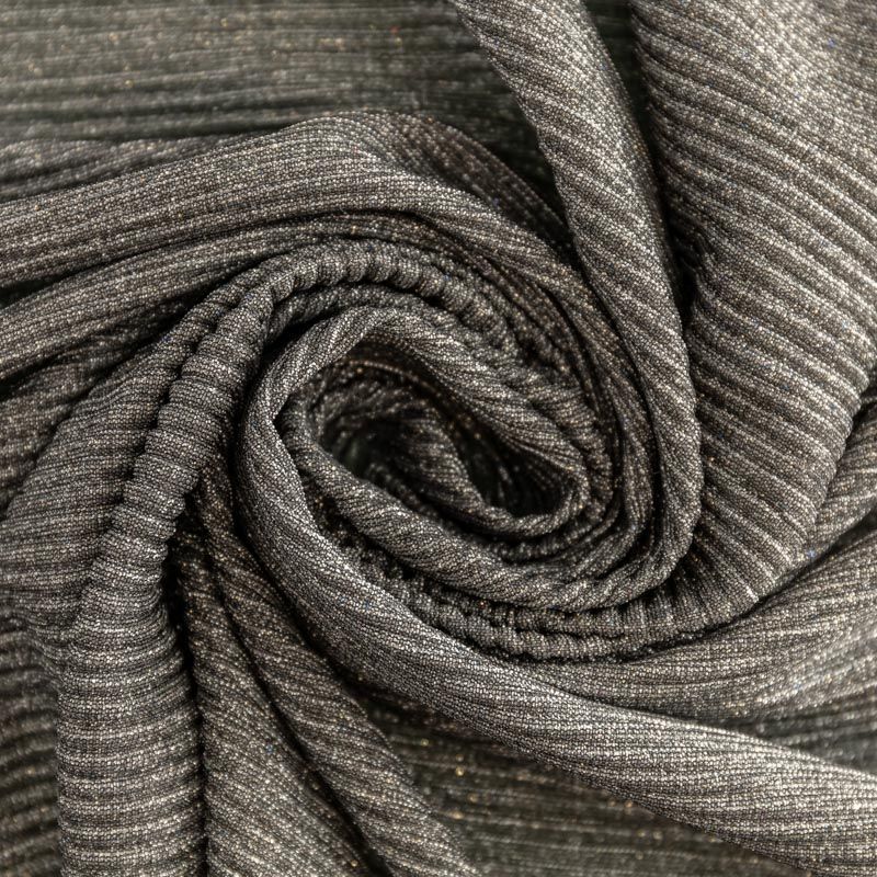 Легкая, слегка прозрачная ткань, с высокой степенью эластичности, поверхность рельефная за счет эффекта гофре и мерцающая за счет напыленного люрекса. Идеальна для облегающих изделий с использованием подклада, платья, топа, юбки, брюк, кардигана. Полоски гофре расположены поперек кромки, набирается объемом.