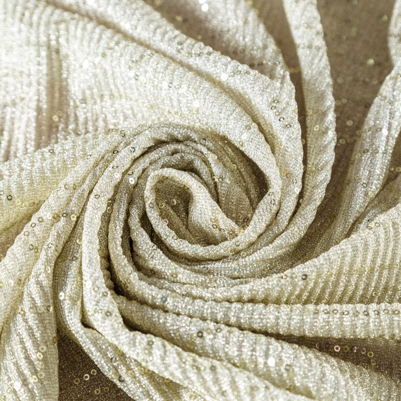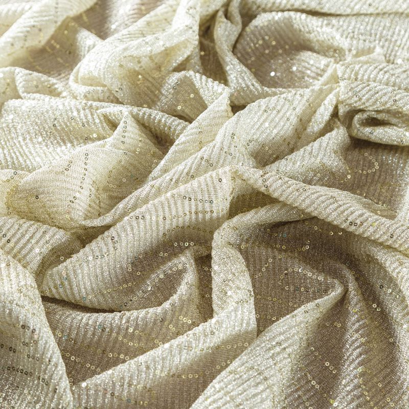 Сложнейшее переплетение люрексовой и металлизированной нити, мерцание пайеток, а также волнообразное гофре создают впечатление живой ткани, которая меняет свой цвет при каждом движении и направлении преломления света. Ткань тонкая, легкая, подойдет для пошива платья, юбки на подкладе, туники, блузы, комбинезона, топа.