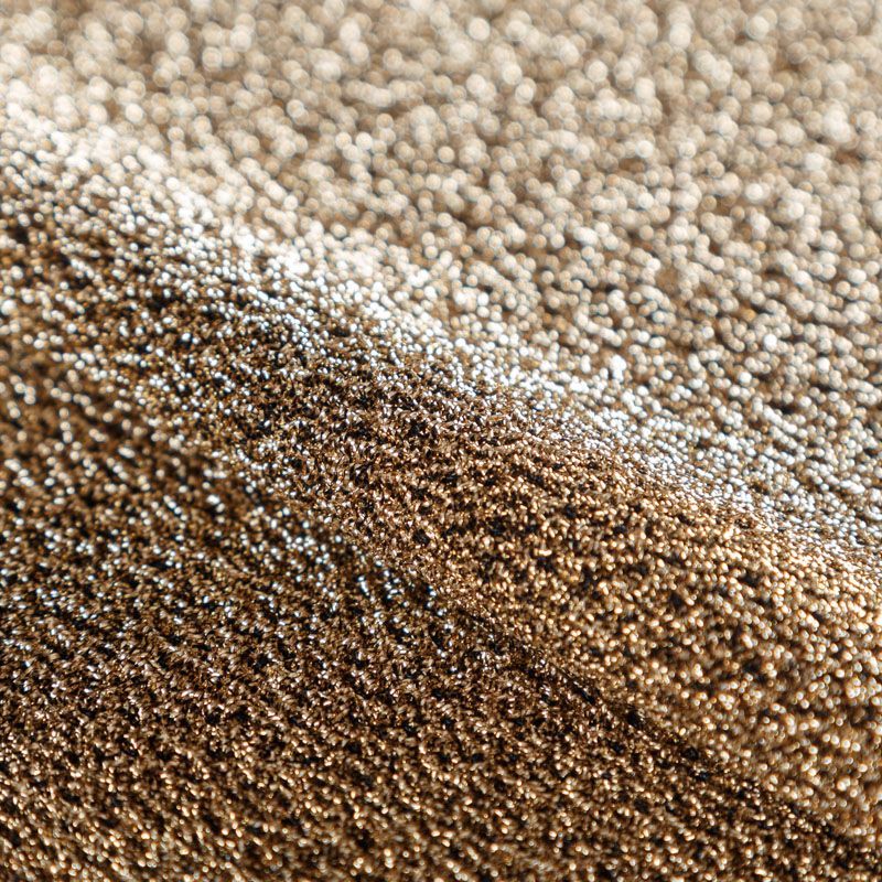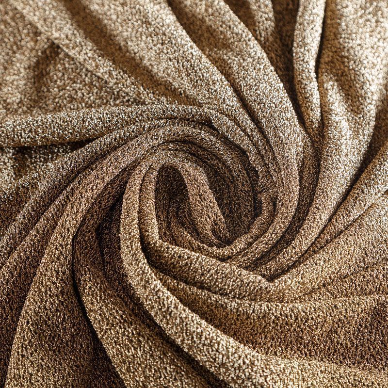 Трикотажное полотно с металлизированным блеском и  мерцанием. Золотистые люрексные нити вплетены в структуру полотна и создают объемный "вспененный" эффект, при этом изнанка гладкая и ровная. Ткань очень приятная к телу, не колется, не просвечивается, очень эластичная, отлично драпируется и ниспадает, красиво ляжет по фигуре. Идеальный вариант для пошива вечерних и нарядных платьев облегающего силуэта, топов, комбинезона, юбки, широких брюк, туник, кардиганов, накидок.