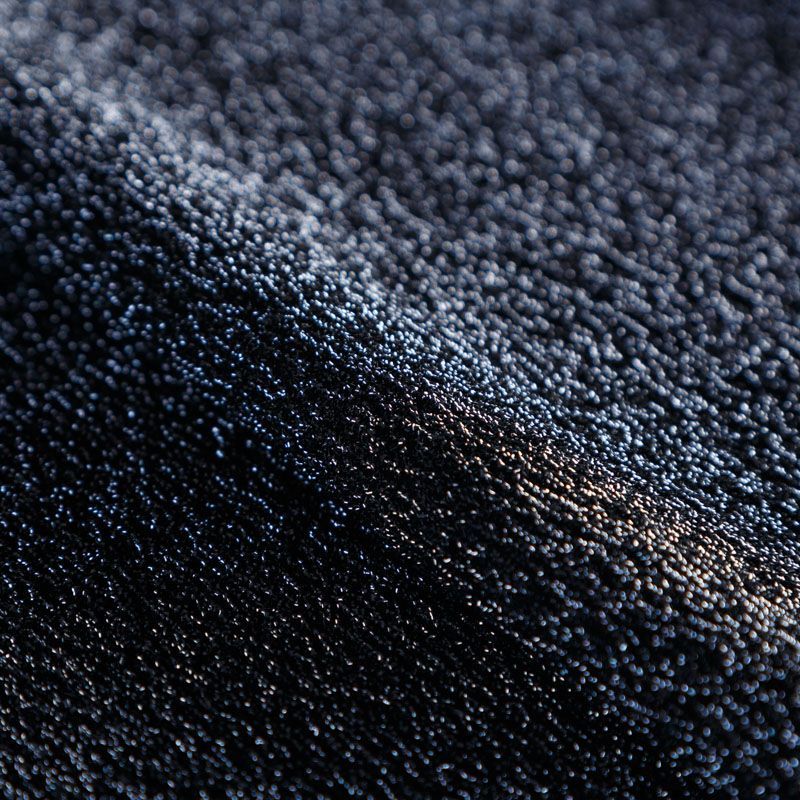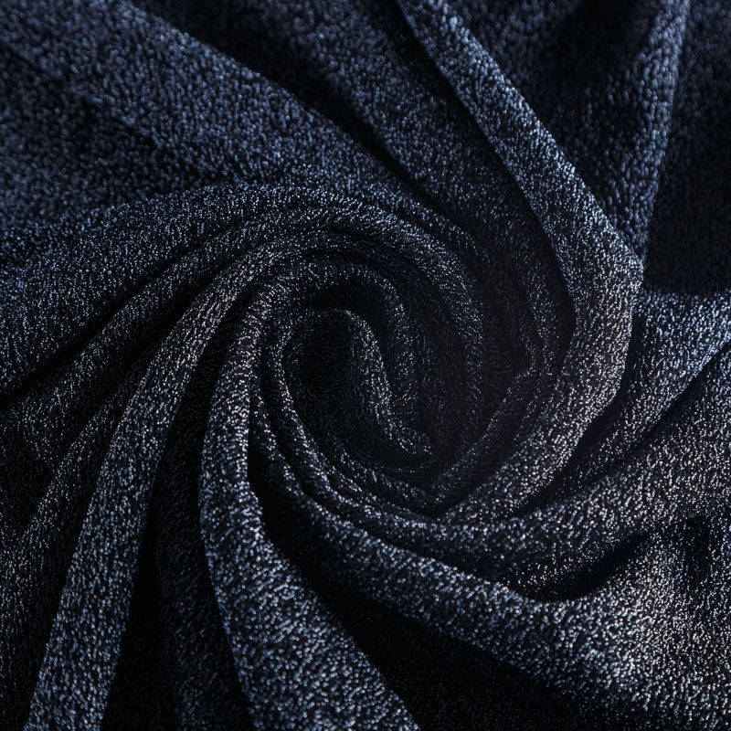 Трикотажное полотно с металлизированным блеском и  мерцанием. Люрексные нити синего оттенка вплетены в структуру полотна и создают объемный "вспененный" эффект, при этом изнанка гладкая и ровная. Ткань очень приятная к телу, не колется, не просвечивается, очень эластичная, отлично драпируется и ниспадает, красиво ляжет по фигуре. Идеальный вариант для пошива вечерних и нарядных платьев облегающего и свободного силуэта, топов, комбинезона, юбки, широких брюк, туник, кардиганов, накидок.